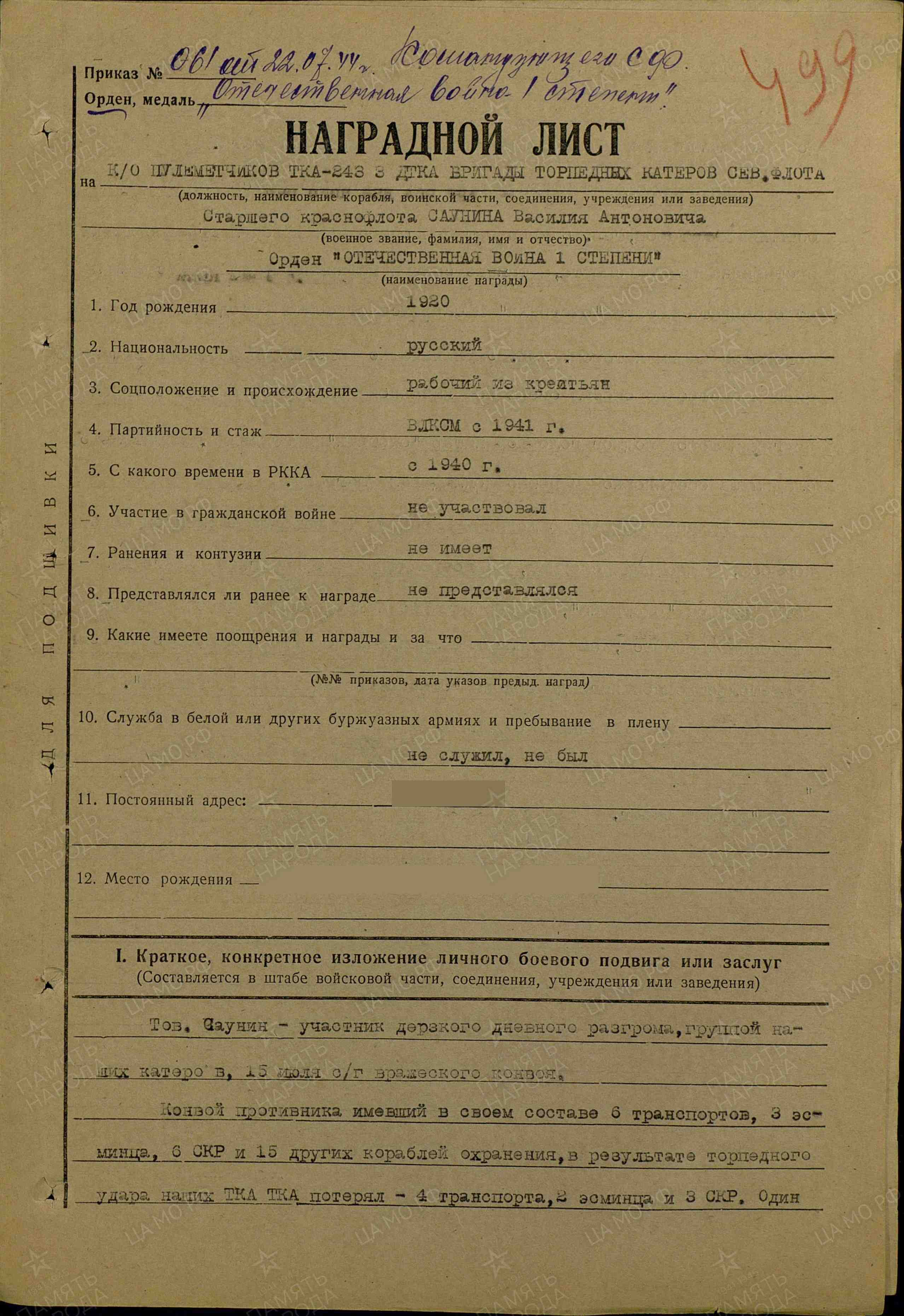 САУНИН Василий Антонович, 1920, с. Берёзовая Грива. Призван в армию 26 окт. 1940 Сталинским РВК г. Казань. Член ВЛКСМ. Воевал под г. Мурманск в составе 69 отд. пулемётного батальона Кольского морского оборонительного района (МОР), красноармеец/ ефрейтор, пулемётчик. С 30 апр. 1944 – ст. краснофлотец/ старшина 2 статьи, пулемётчик/ ком. отделения пулемётчиков торпедного катера № 243 III дивизиона Печенгской бригады ТК Северного флота. Участник морских рейдов и потопления транспорта водоизмещением 6 тыс. тонн. Награждён медалью «За оборону Советского Заполярья», орденами Отечественной войны 1 ст. (1944), Красной Звезды(1944). Демобилизован в окт. 1946.