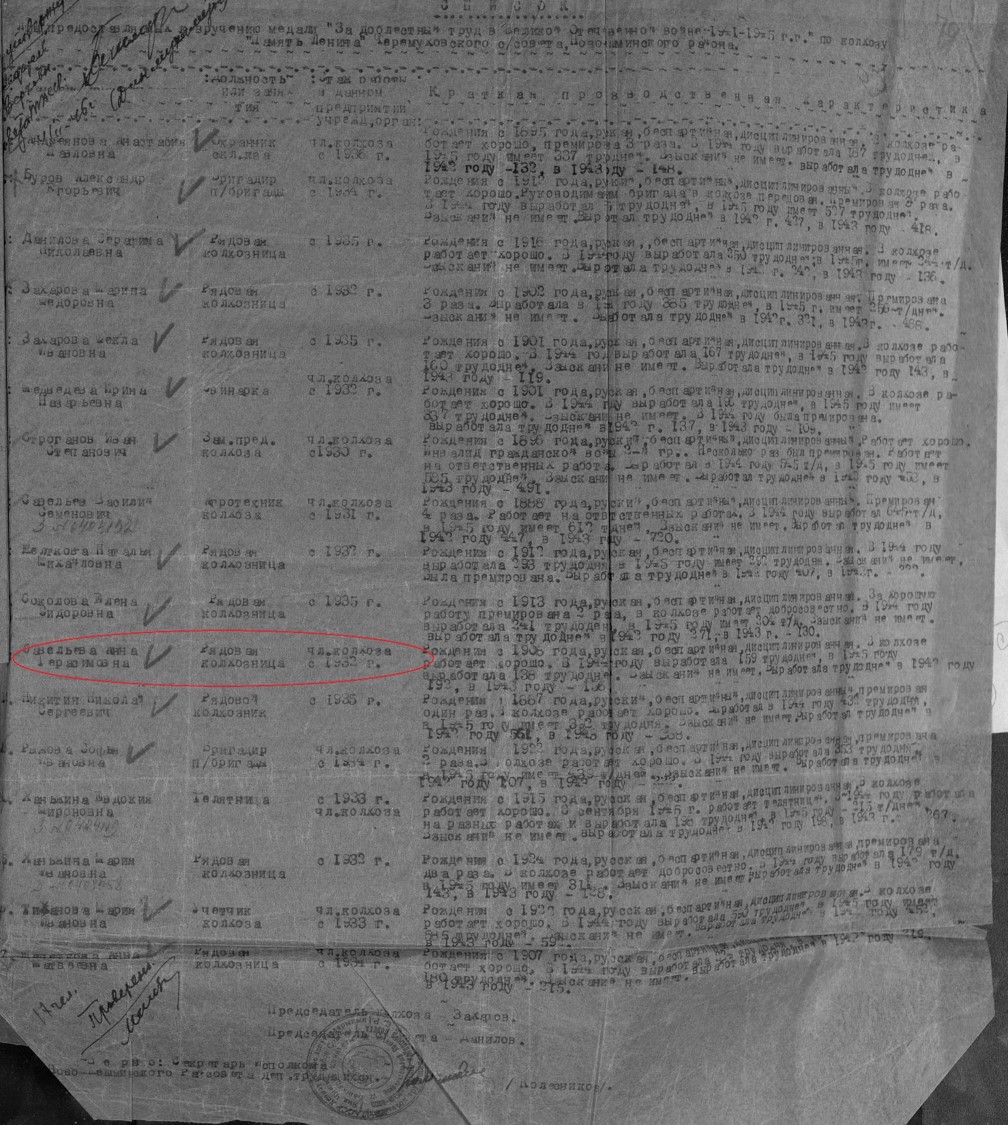 Савельева Анна Герасимовна родилась в 1906 году в с.Сл Черемуховая Казанской губернии Чистопольского уезда Новошешминской волости. В годы Великой Отечественной войны работала в колхозе "Память Ленина" колхозницей. Награждена медалью "За доблестный труд в Великой Отечественной войне 1941–1945 гг." (акт от 28 апреля 1947., фонд 3610, опись 2, дело № 324, лист 48).