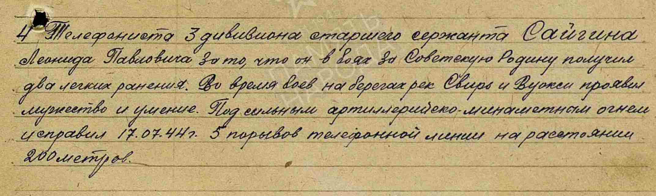 САЙГИН Леонид Павлович, 1904, с. Алексеевское. Мобилизован в 1941 Мамадышским РВК.В боях перенёс два ранения. Повторно мобилизован 23 апр. 1943. Воевал на 1 Украинском, Карельском, Ленинградском фронте в составе 60 А/ 7 А/ 23 А/ 8 А. Ст. сержант, телефонист дивизиона 355 АП 327 СД. Награждён медалью «За боевые заслуги».