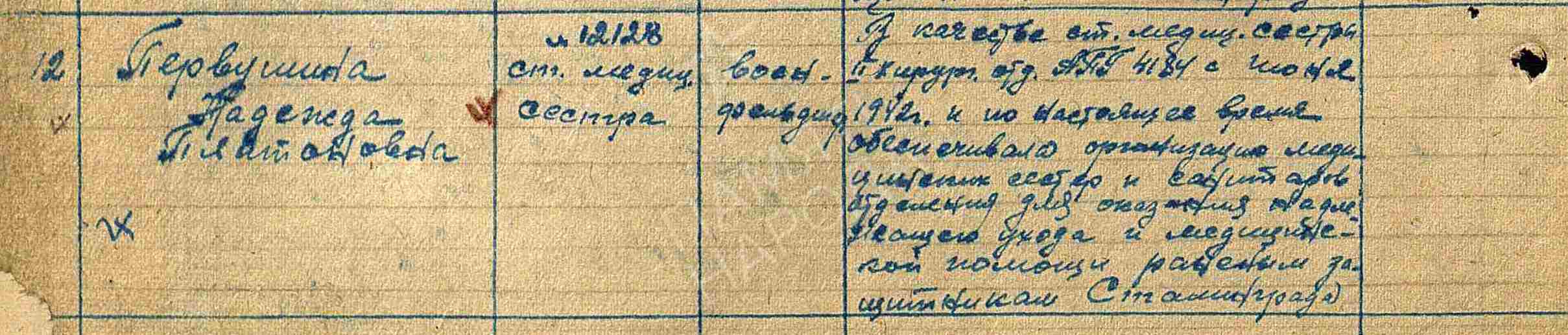СЕНЯВСКАЯ (ПЕРВУШИНА) Надежда Платоновна, 1921, д. Кошаново. Мобилизована 17 окт. 1941 Кагановичским (Рубежанским) РВК Ворошиловградской (Луганской) обл. УкрССР. В действующей армии с июня 1942. Военфельдшер, мл. лейтенант медицинской службы, ст. медсестра 2 хирургического отделения Армейского полевого госпиталя АПГ 4184 и ПЭП 109 в составе 62 А Сталинградского/ Донского фронта, 8 гв. А Юго-Западного/ 3 Украинского/ 1 Белорусского фронта. «Проявила исключительную чуткость и заботу о раненых. В боях под Донцом и Запорожьем отделение пропустило свыше 5 000 раненых, оказана высококвалифицированная помощь, большая часть раненых возвращена в строй. В ходе боёв на р. Висла лично оказала мед. помощь 350 раненым бойцам и командирам». Награждена медалями «За боевые заслуги», «За оборону Сталинграда», «За взятие Берлина», орденами Красной Звезды, Отечественной войны 2 ст. (1985). Уволена в запас 4 мая 1947.