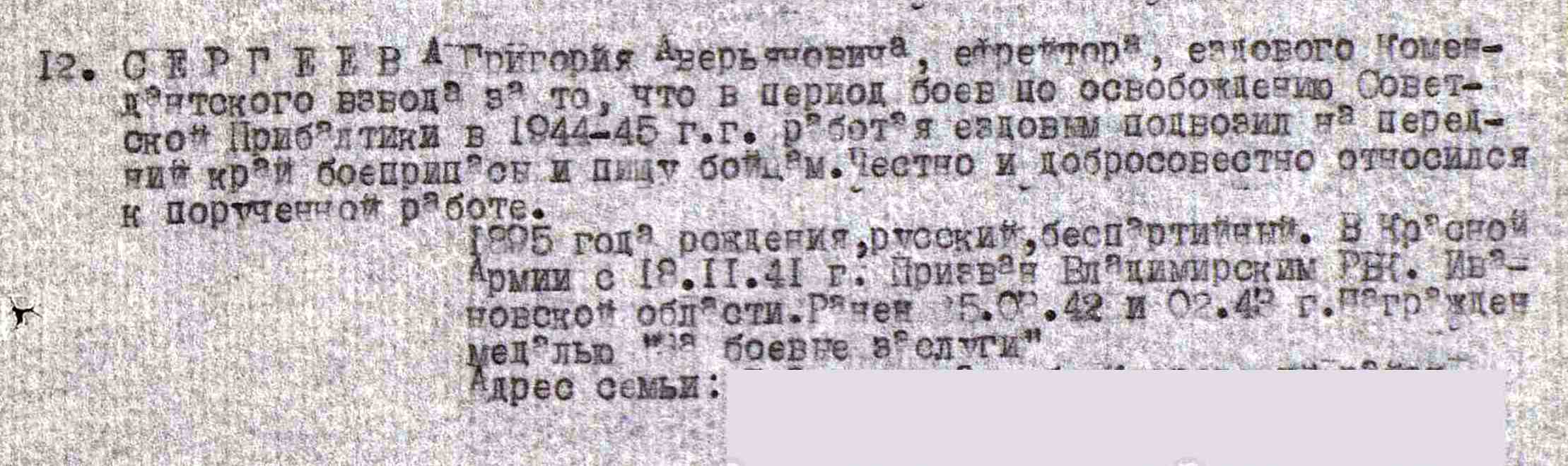 СЕРГЕЕВ Григорий Аверьянович, 1899, д. Малый Красный Яр. В 1918-1922 - участник Гражданской войны в составе 7 Самарской кав. дивизии. Мобилизован Владимирским РВК Ивановской обл. 18 нояб. 1941. Воевал на Калининском, 1 Прибалтийском, Западном, 3 и 2 Белорусском фронте в составе 22 А/ 30 А/ 39 А/ 43 А/ 4 УдА/ 6 гв. А. В боях перенёс два ранения. Ефрейтор, боец 996 дивизионного вет. лазарета/ ездовой комендантского взвода 158 СД. Награждён медалями «За боевые заслуги», «За отвагу».