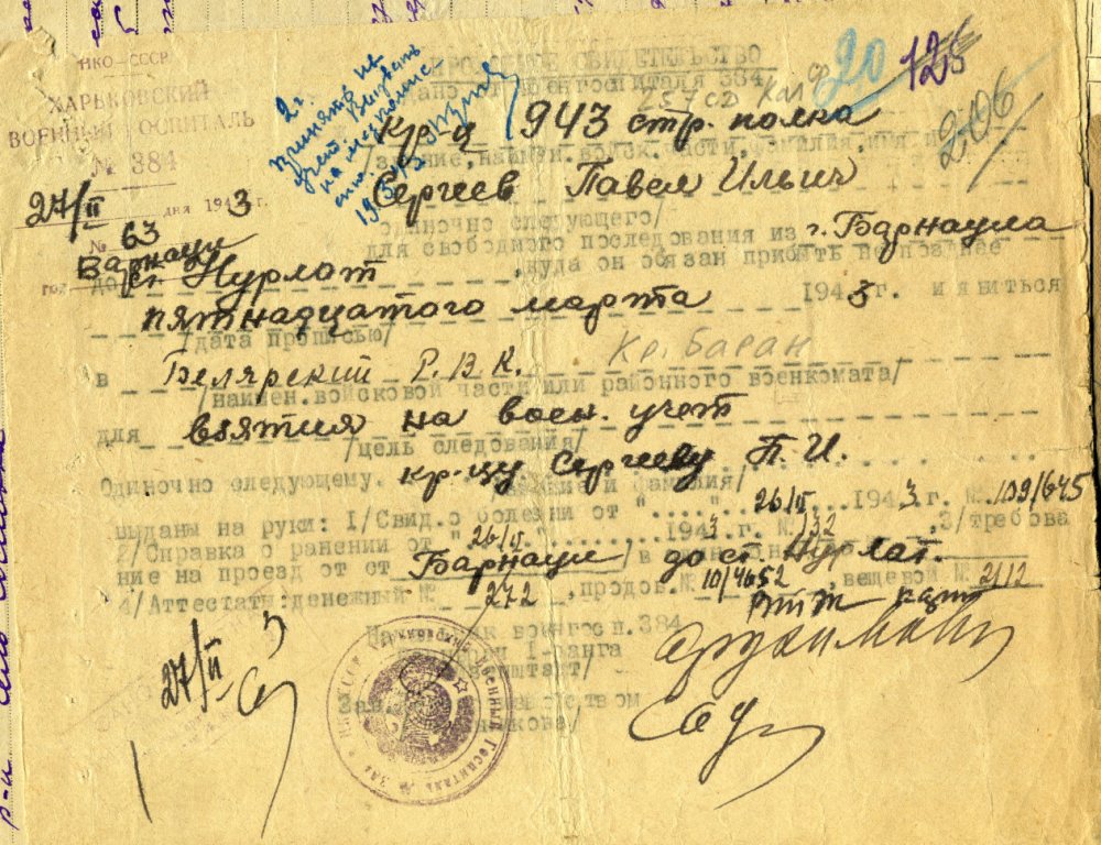 СЕРГЕЕВ Павел Ильич, 1918, с. Крещёный Баран. Мобилизован Билярским РВК. Красноармеец, 943 СП 257 СД 3 Уд. А Калининского фронта. Получил ранение в боях. Находился на излечении в Харьковском военном госпитале № 384 (г. Барнаул). Справка о ранении выдана 26 февраля 1943 г. В последующем работал в совхозе им. Бутлерова разнорабочим. Скончался в 1979 г., похоронен в с. Кр. Баран.