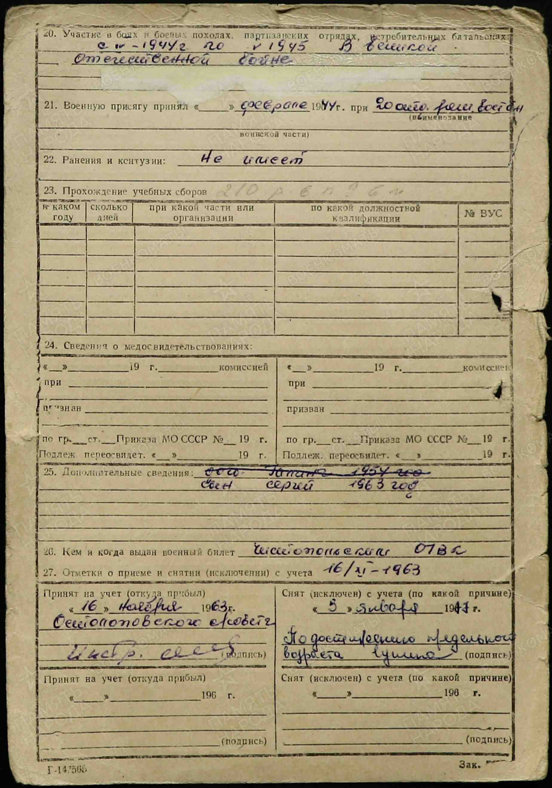 ШАБРОВ Александр Иванович, 1926, с. Остолопово. До призыва в армию работал в к-зе «Красное Прикамье». Мобилизован Алексеевским РВК 4 нояб. 1943. Член ВЛКСМ. Сержант/ ст. сержант, орудийный и оружейный мастер 159 ТБр. Воевал в составе 1 ТК, 2 гв. А/ 51 А на 1 Прибалтийском/ 3 Белорусском фронте с 1 апр. 1944. Демобилизован из 1437 САП 4 окт. 1950. Работал плотником в к-зе «Россия». Награждён медалью «За отвагу», орденом Отечественной войны 2 ст. (1985). Скончался в 2001.