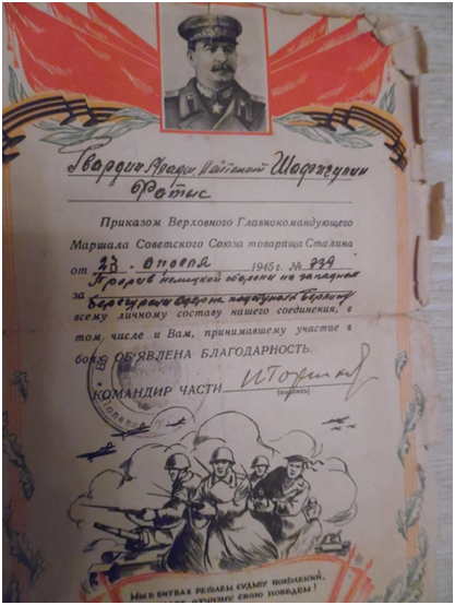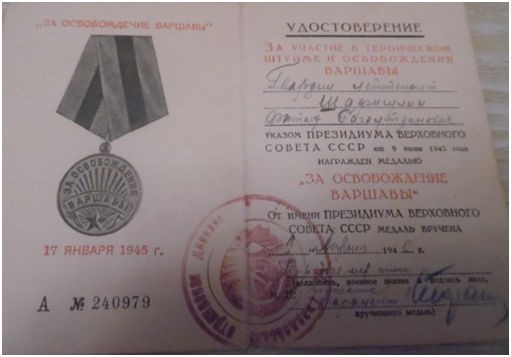 Награжден орденом Красная Звезда, медалью «За оборону Ленинграда», медалью «За освобождение Варшавы», «За взятие Берлина», орденом Отечественной войны II степени и медалью «В память 300-летия Санкта – Петербурга».