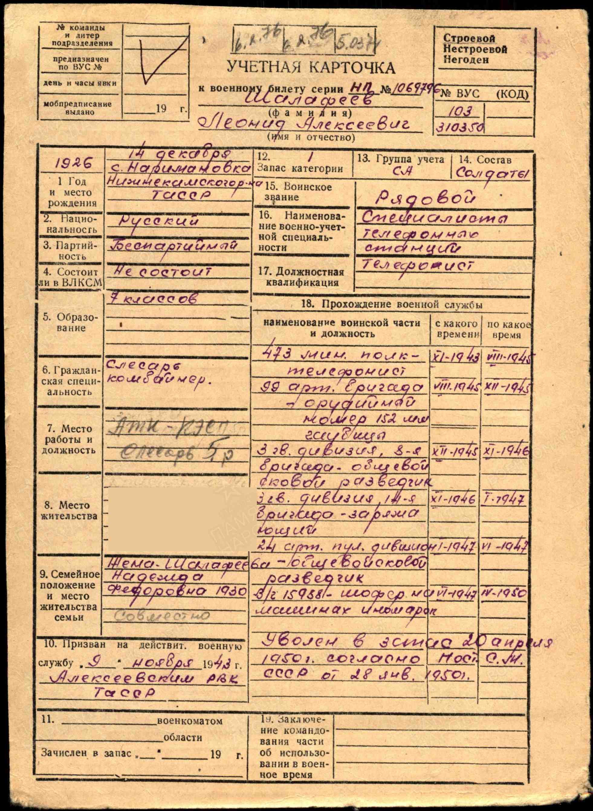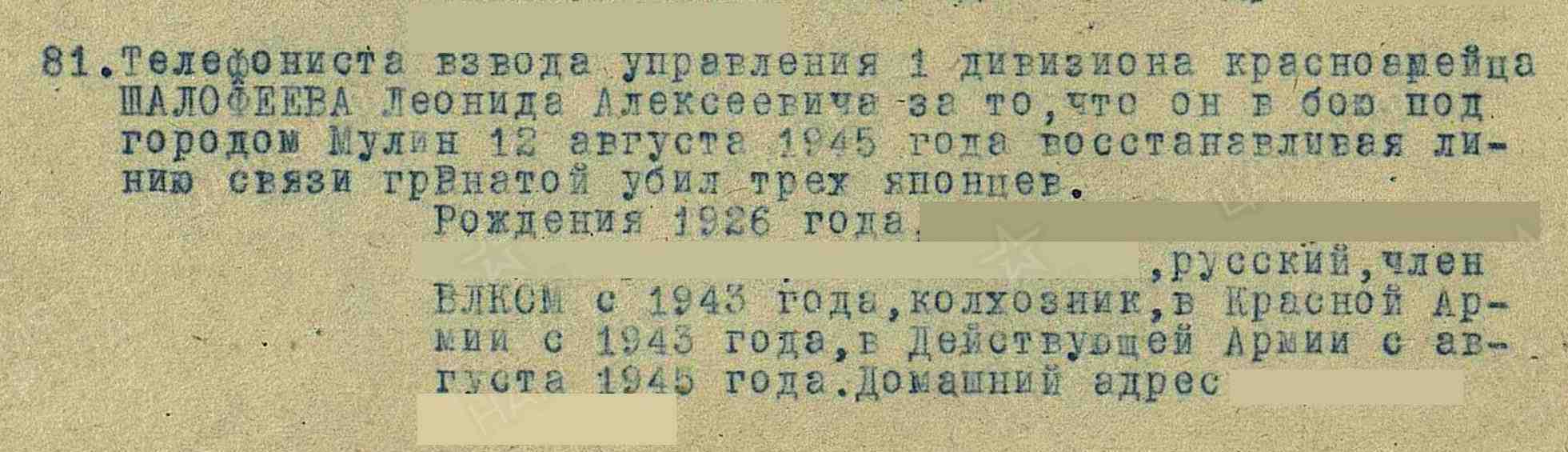 ШАЛАФЕЕВ Леонид Алексеевич, 1926, с. Нариман, Шереметьевский (Нижнекамский) р-н. Жил в с. Лебедино. До призыва в армию работал в к-зе «Восход». Член ВЛКСМ. Мобилизован Алексеевским РВК 9 нояб. 1943. Служил на Дальнем Востоке, принимал участие в Советско-японской войне. Красноармеец, телефонист 473 МинП 53 МинБр РГК 25 А, 5 А 1 Дальневосточного фронта. Демобилизован 20 апр. 1950. Награждён медалями «За боевые заслуги», «За победу над Японией», орденом Отечественной войны 2 ст. (1985).