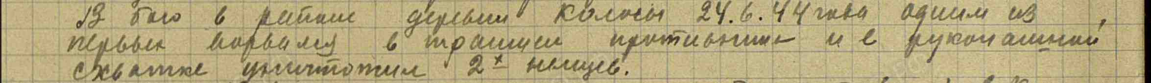 В боях за важный стратегический узел противника город Т….. 26-29.01.1945 г.миномет тов. Шалашина ведет огонь по автомашинам противника и отбивая …. Когда на батарею напали немцы и огня из миномета невозможно было вести, тов.Шалашов с автоматом в руках ….. захватил ее при этом уничтожил свыше 20 гитлеровцев».