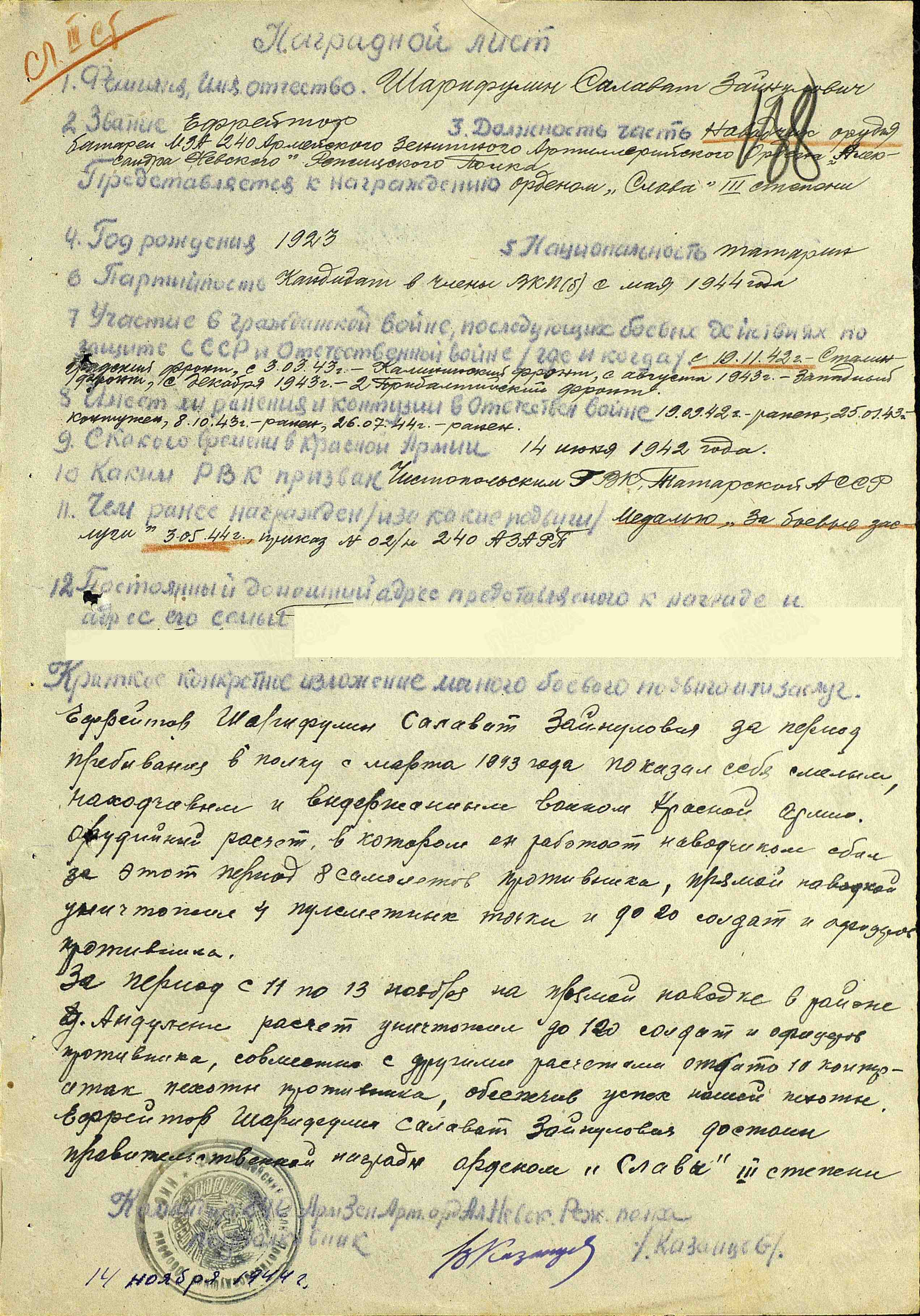 Салават Зайнулович Шарафулин родился в 1923 г. в с.Каргали, Кзыл-Армейского р-на, ТАССР. 14 июня 1942 г. призван в ряды Красной Армии Чистопольским военным комиссариатом. Служил в звании ефрейтора, в должности наводчика орудия батареи МЗА 240 Армейского Зенитного Артиллерийского ордена «Александра Невского» Режицского полка. Имел ранения 19.09.1942 г., 25.01.1943 контужен, 08.10.1943г., 26.07.1944 г.