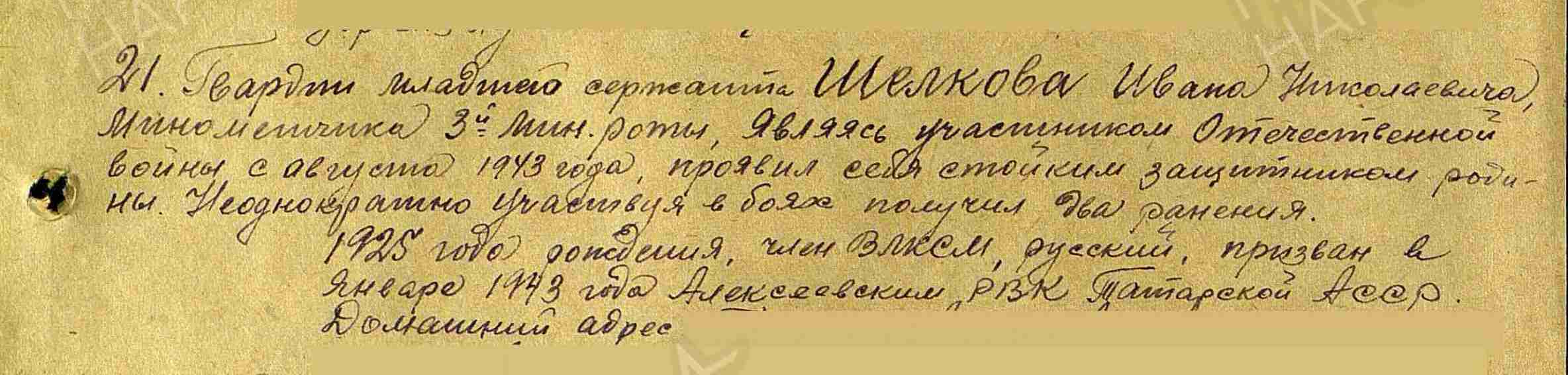 ШЕЛКОВ Иван Николаевич, 1925, с. Шама. Член ВЛКСМ. Мобилизован Алексеевским РВК 5 янв. 1943. На фронте с авг. 1943. Гв. мл. сержант, миномётчик 247 гв. СП 84 гв. СД 11 гв. А БрянФ, 2 ПрибФ, 1 ПрибФ, 3 БелФ. Имел два лёгких и одно тяжёлое ранение в грудь. Был на излечении в ЭГ 2854. В 1945 – ст. сержант, ком. миномёта 51 тяж. миномётной бригады 31 АртД прорыва РГК 10 АртК 1 УкрФ. В боях за г. Берлин, 28 апр. 1945, огнём миномёта разрушил дом – узел сопротивления гитлеровцев, убив при этом до 15 солдат противника. Награждён медалями «За боевые заслуги», «За взятие Берлина», «За освобождение Праги», орденами Красной Звезды, Славы 3 ст., Отечественной войны 1 ст. (1985). Демобилизован в окт. 1945. После войны работал нач. планового отдела Мамадышского леспромхоза.