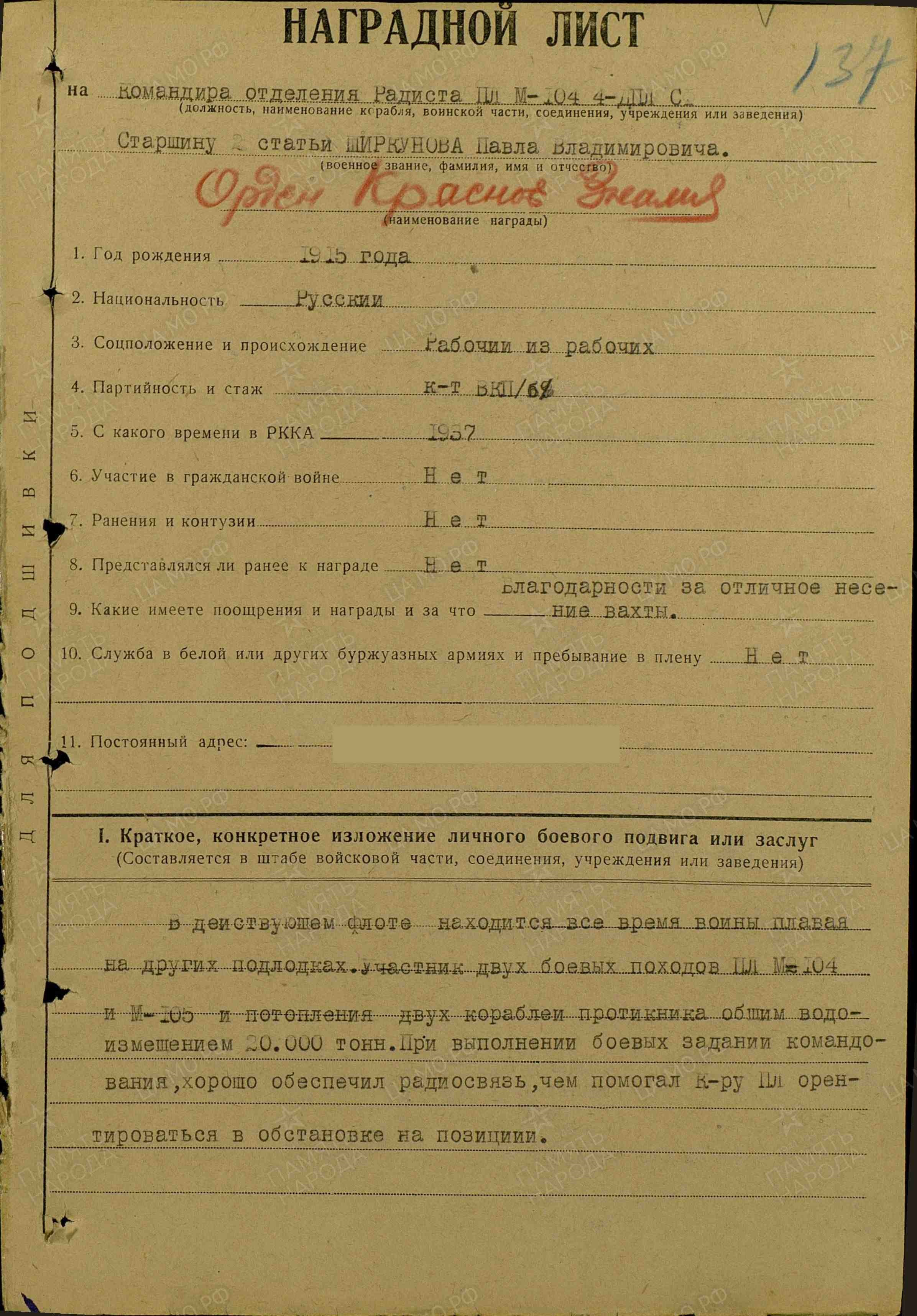 …«Командир отделения радистов старшина второй статьи Павел Владимирович Ширкунов начал службу в 1936 году радистом на подводных лодках Северного флота. Свой боевой счёт открыл в июле 1941 года на лодке "Щ-402", где выполнял обязанности гидроакустика. О том боевом походе "Щ-402" хорошо знал и сам Лукьянов, о нём говорили тогда в Полярном. Именно с этого похода начался счёт потопленных подводниками Заполярья вражеских транспортных судов и боевых кораблей.