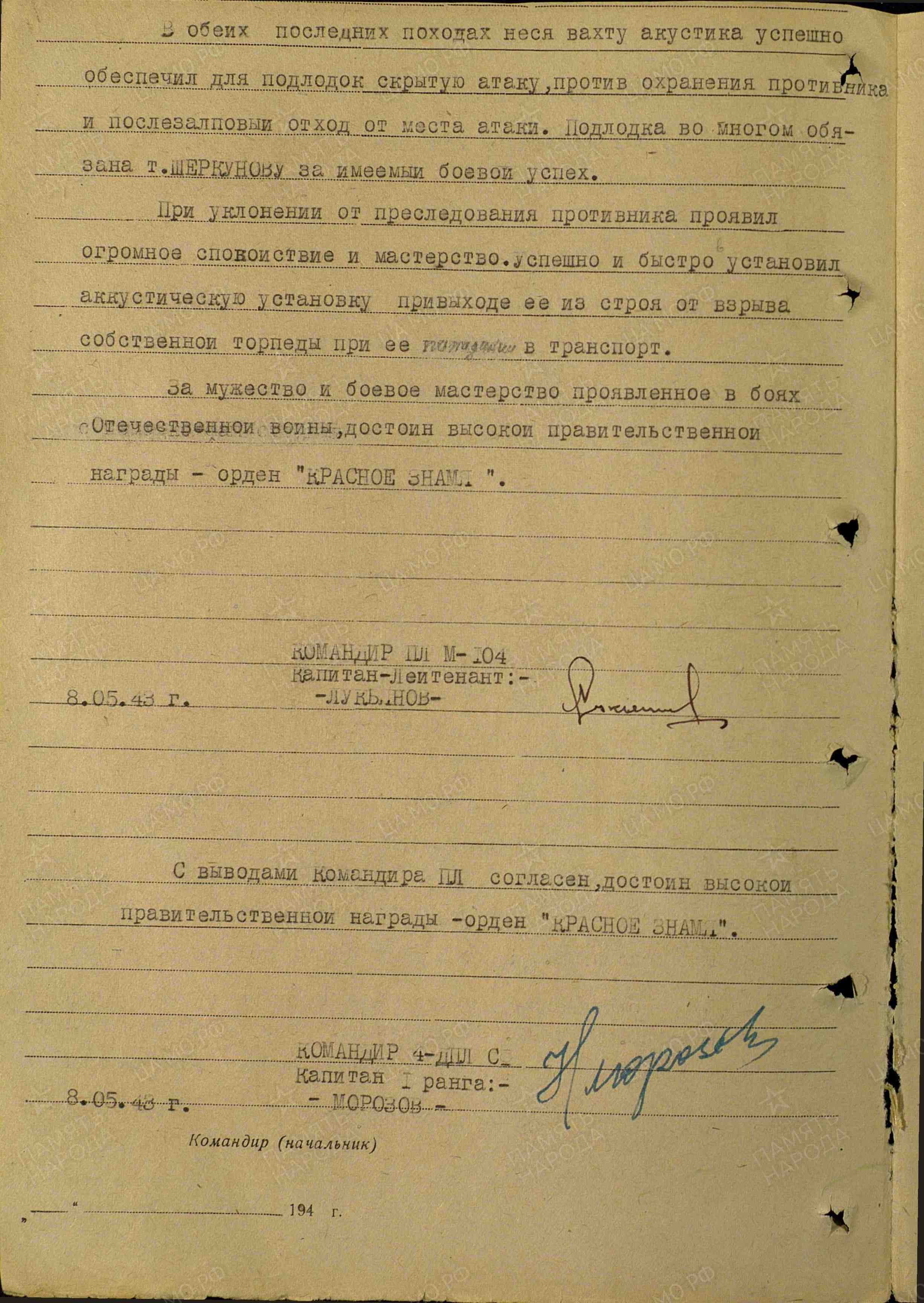 Фёдор Иванович читал характеристику П. В. Ширкунова и представлял мысленно, как проходил тот памятный боевой поход. Подводная лодка "Щ-402" вышла на боевое задание в район Порсангер-фиорда (Северная Норвегия) с целью перехвата и уничтожения вражеских кораблей. На поверхность лодка всплывала только для зарядки аккумуляторных батарей. Все наблюдения производились по акустическим приборам. Перископом пользовались лишь для определения места нахождения. Наконец, был обнаружен вражеский транспорт.