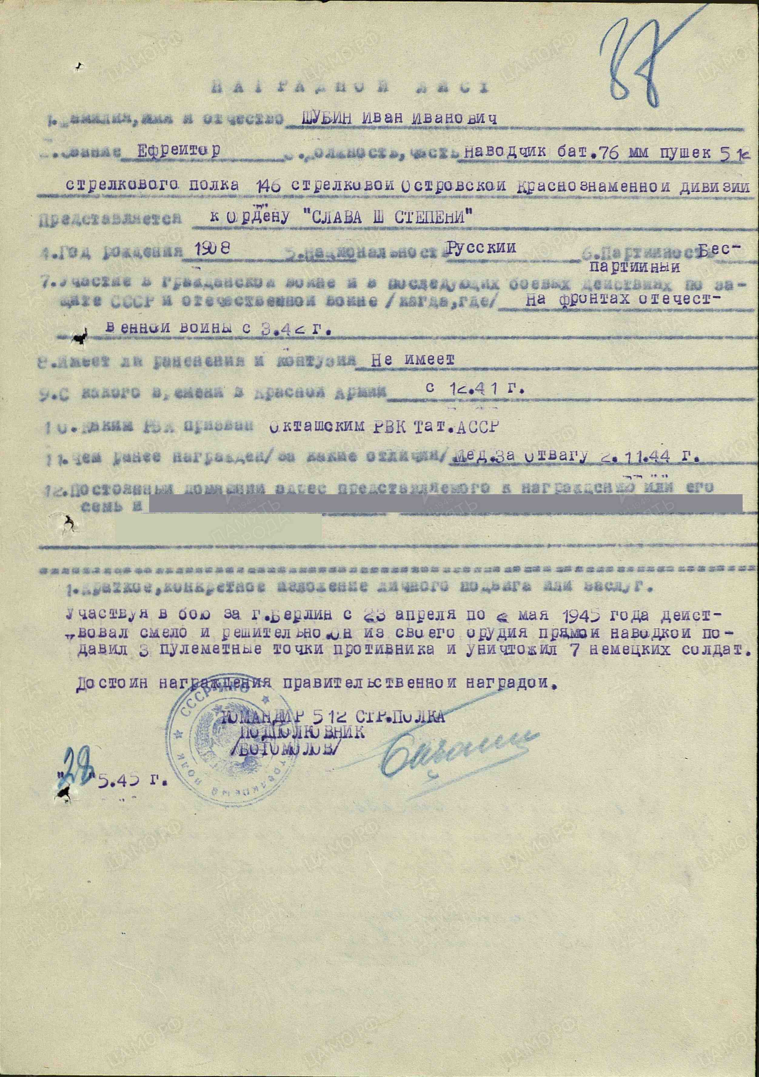 Иван Иванович Шубин родился в 1908 г.р. в г.Чистополе, ТАССР. В 1941 г. призван в ряды Красной Армии Окташским районным военным комиссариатом. Служил в звании ефрейтора, в должности наводчика бат.76 мм. Пушек 51 стрелкового полка 146 Стрелковой Островской дивизии. Награжден орденом Красной Звезды (28.05.1945).