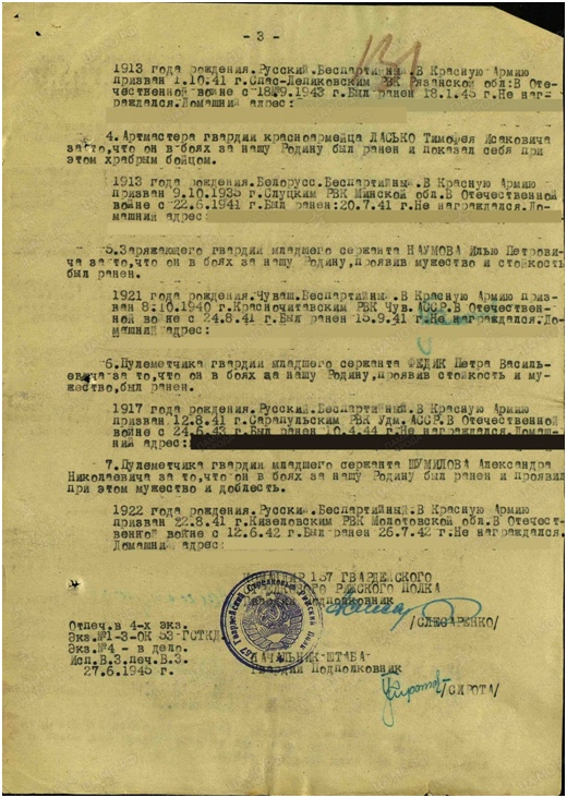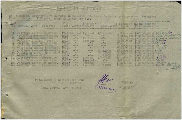 ШУМИЛОВ АЛЕКСАНДР НИКОЛАЕВИЧ (2.04.1922-30.11.2006 г.г.) родился с. Гремячка Лаишевского кантона Татарской АССР (Рыбно-Слободский р-н). В армию был призван 06.12.1941г. Рыбно-Слободским РВК. Поступил на службу 22.08.1941 года. Участвовал в боях на Юго-Западном и Сталинградском фронтах. Командующий армии И.С. Конев. Служил в пехоте командиром взвода. В начале 1943 года в составе 6 мсбр (мотострелковая бригада) 2 б-на (батальон) попал в плен, но был освобожден.