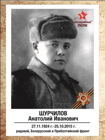 ШУРЧИЛОВ АНАТОЛИЙ ИВАНОВИЧ Район: НижнекамскийШурчилов Анатолий Иванович (27.11.1924-25.10.2015гг.) - рядовой, Белорусский и Прибалтийский фронтУчастники войны Опубликовано 3 мая, 2018 - 16:25 пользователем Малова Ольга Ни...