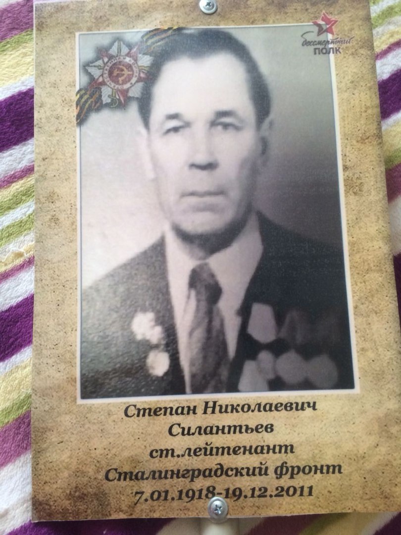 СИЛАНТЬЕВ СТЕПАН НИКОЛАЕВИЧ (7.01.1918 – 19.12.2011 г.г.): Родился в деревне Соловцово Иссинского района Пензенской области. Призван в 1942 году. Закончил 1-ое Владивостокское пехотное училище. В звании старшего лейтенанта воевал на сталинградском фронте. В 1943 году в Сталинградской битве дедушка потерял ногу, долго пролежал в госпитале, затем его комиссовали. Награжден орденами Отечественной войны I и II степени, медалями «За отвагу», «За Победу над Германией», юбилейными медали. После войны работал директором Толбазской средней школы Аургазинского района Республики Башкортостан. Заслуженный учитель Башкирской АССР.