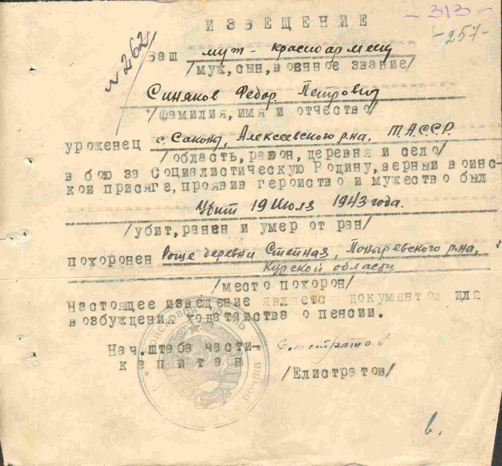 СИНЯКОВ Фёдор Петрович, 1894(93), с. Саконы. До призыва в армию работал в к-зе «Кама». Мобилизован Алексеевским РВК 9 дек. 1942, повторно 3 марта 1943. Красноармеец, радиотелеграфист 86 тяжёлой гаубичной АБр 5 АртД прорыва 4 АртК 13 А Центрального фронта. Погиб 19 июля 1943, д. Степная, Поныровский р-н, Курская обл.