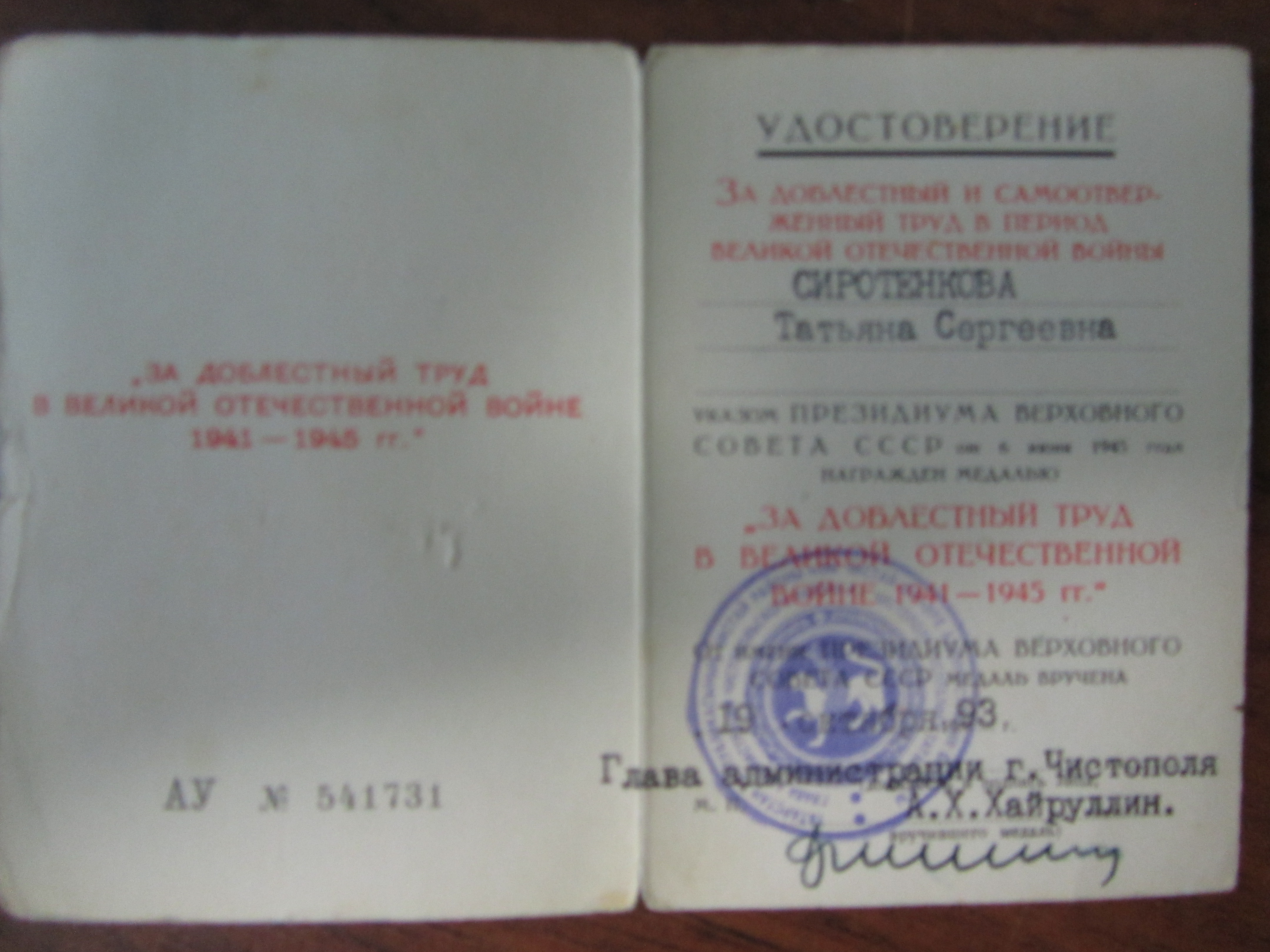 Родилась в 1926 году в с. Изгары Чистопольского р-на. Во время войны с подругой Анной были мобилизованы в Ивановскую область копать окопы. Награждена медалью "За доблестный труд в Великой Отечественной войне1941-1945гг." от 19.10.1993 года, юбилейными медалями.