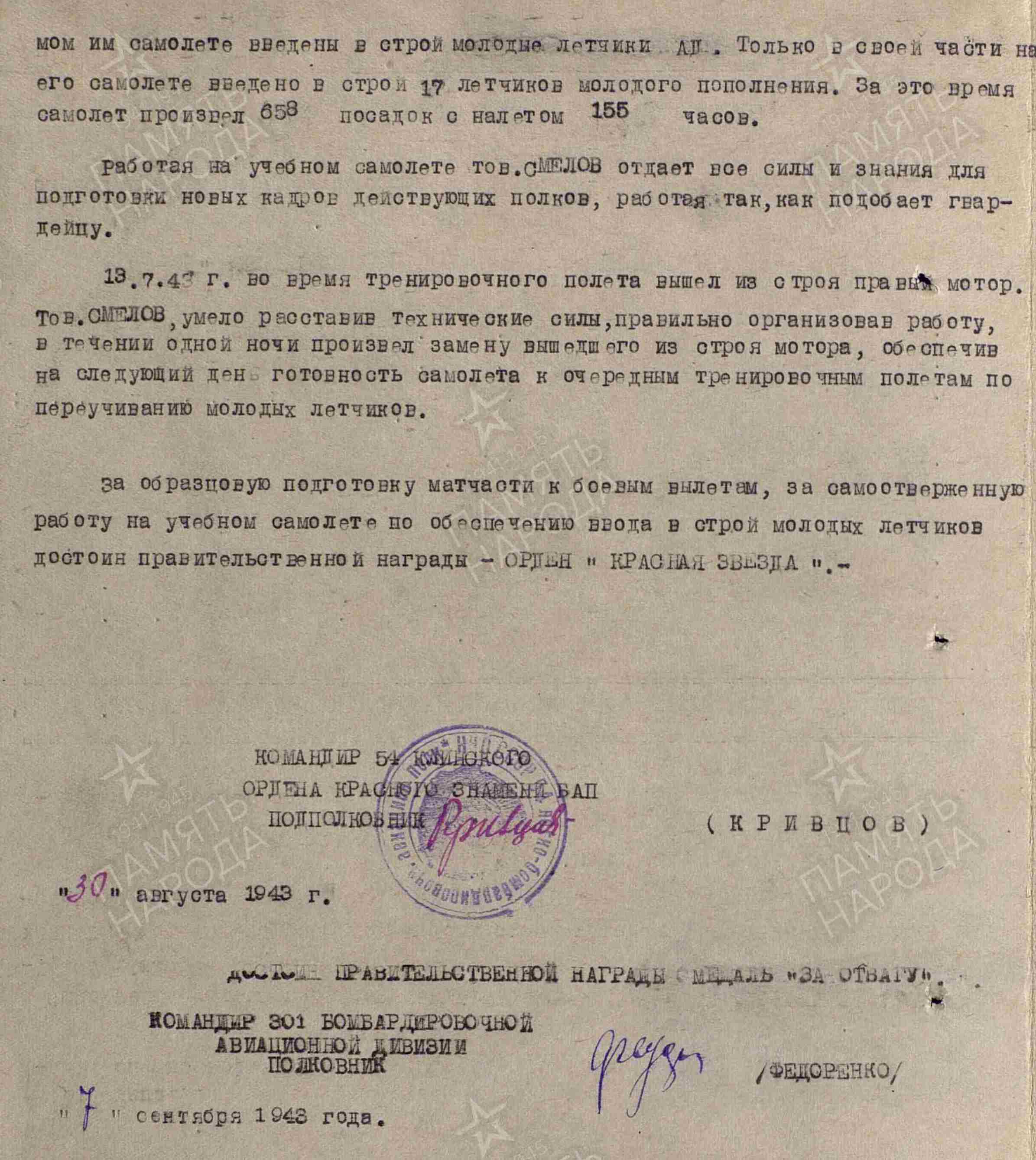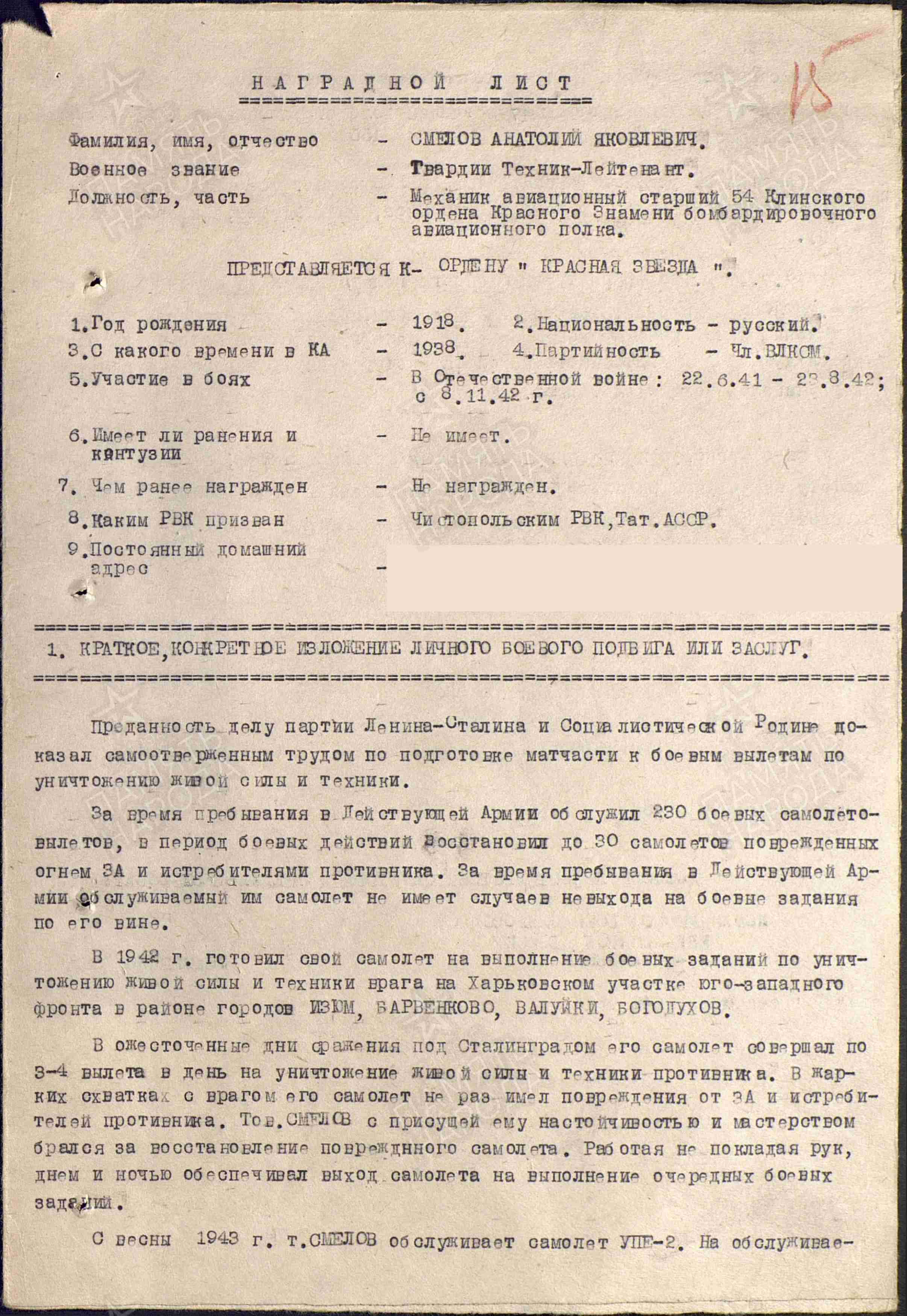 СМЕЛОВ Анатолий Яковлевич, 1918, д. Малый Красный Яр. Член ВЛКСМ. Призван 15 нояб. 1938 Чистопольским РВК. Техник-лейтенант/ гв. техник-лейтенант, ст. авиамеханик 54 бомбардировочного авиац. полка. Участник войны с 22 июня 1941 по 23 авг. 1942 на Юго-Западном фронте, с 8 нояб. 1942 – в боях под Сталинградом. С весны 1943 – в учебном подразделении полка в составе 301 БАД 3 БАК 15 ВА Брянского фронта, 16 А 1 Белорусского фронта. Уволен в запас 21 дек. 1945. Награждён медалями «За оборону Сталинграда», «За отвагу».