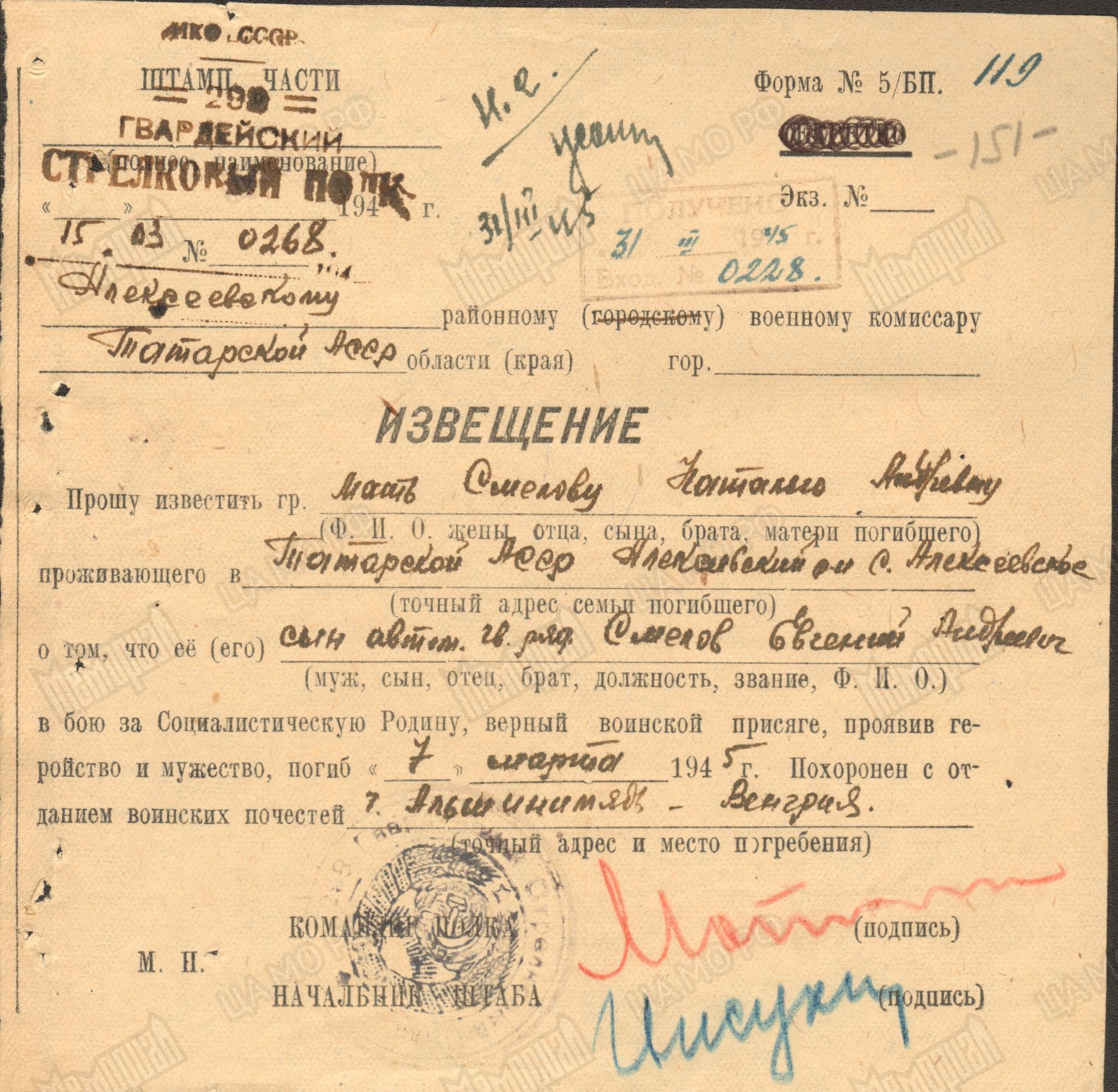 СМЕЛОВ Евгений Андреевич, 1925, с. Алексеевское. Мобилизован Алексеевским РВК в 1943 г. Гв. красноармеец, автоматчик 298 гв. СП 100 гв. СД. Погиб (умер от отравления) 7 марта 1945 г. Похоронен в г. Альтшинимядь (Альшинимяде, Алшонемеди), Венгрия.
