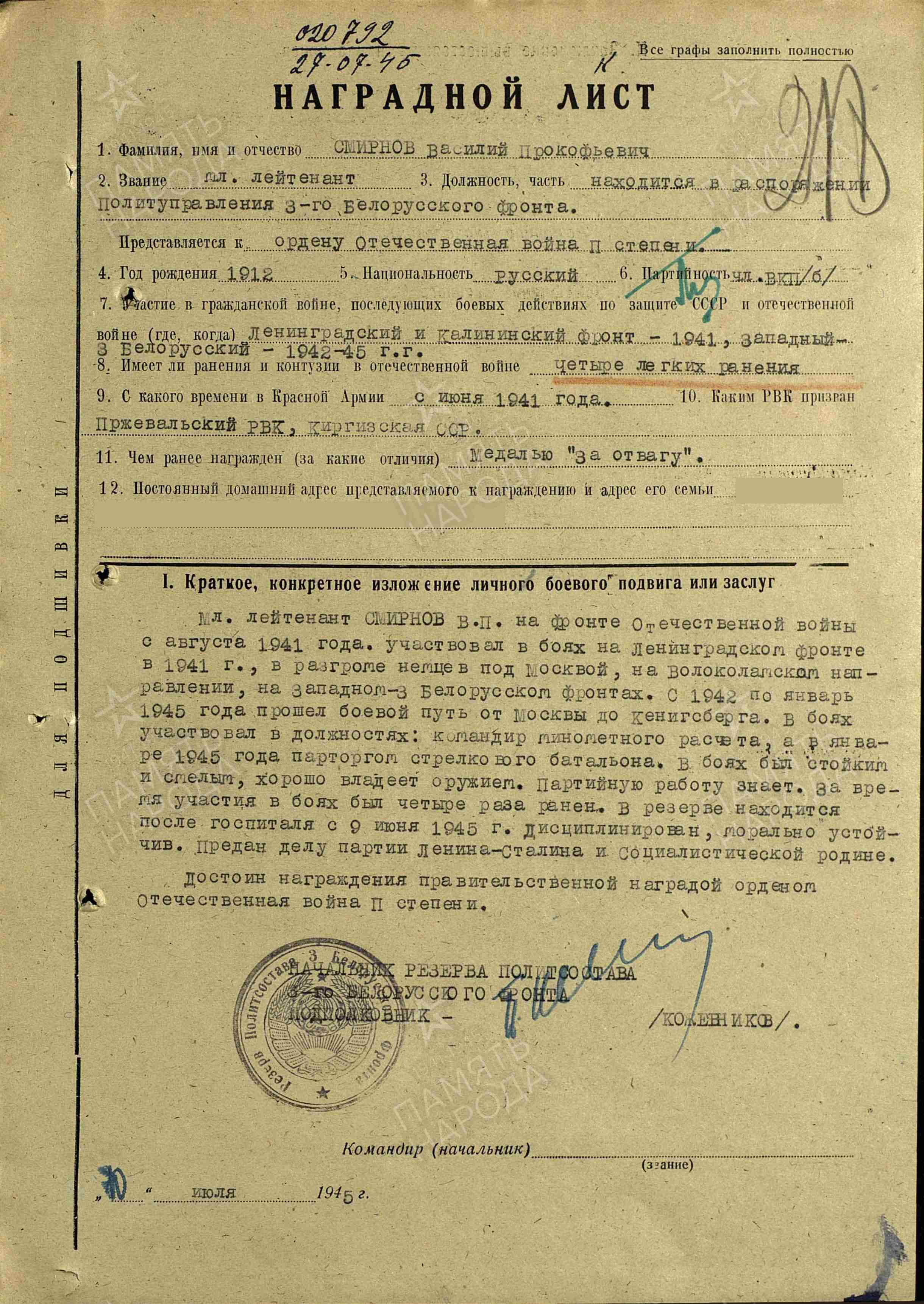 СМИРНОВ Василий Прокопьевич (Прокопьевич), 1912, с. Арбузов Баран. Мобилизован в июле 1941 Пржевальским РВК Иссык-Кульской обл. КиргССР. Член ВКП(б). Воевал с янв. 1942 на Калининском, Западном, 3 Белорусском фронте в составе 20 А/ 5 А/ 33 А. Участник контрнаступления под Москвой, освобождения Смоленщины и Белоруссии, боёв в Вост. Пруссии. Красноармеец/ мл. лейтенант, Миномётчик/ ком. миномётного 120 мм расчёта/ парторг батальона 1075 СП 316 СД/ 785 СП 144 СД. В боях перенёс четыре лёгких ранения. Награждён медалями «За отвагу», «За взятие Кенигсберга», орденом Отечественной войны 2 ст. (1945). Уволен в запас 23 авг. 1946.