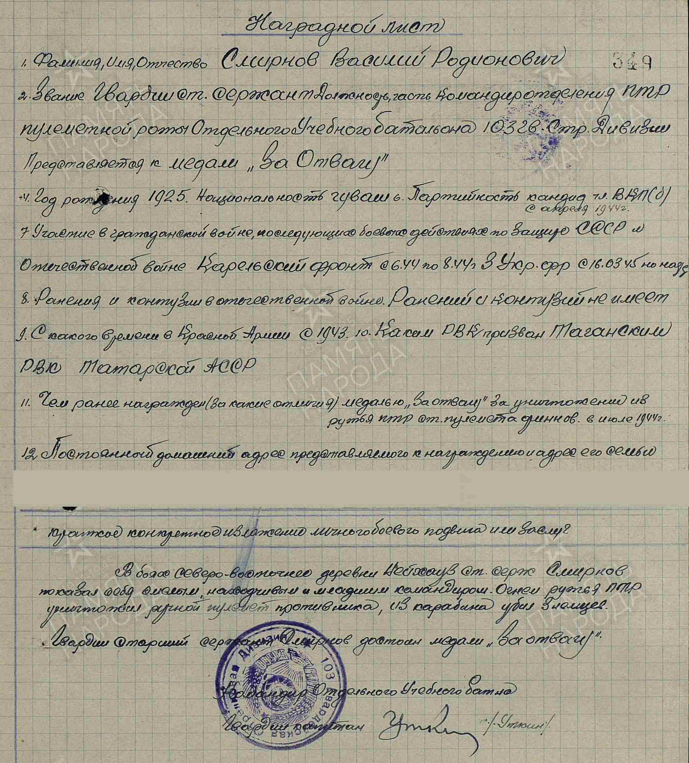 СМИРНОВ Василий Родионович, 1925, д. Тиган Булак. До призыва в армию работал в к-зе им. Карла Маркса. Мобилизован Билярским РВК 4 янв. 1943. Воевал на Карельском, 2 и 3 Украинском фронте в составе 7 А/ 9 гв. А. Участник боёв в Карелии, Венгрии, Австрии, Чехословакии. Гв. красноармеец, стрелок роты ПТР 302 гв. СП 98 гв. СД/ гв. ст. сержант, ком. отделения ПТР пулемётной роты отд. учебного батальона 103 гв. СД. Член ВЛКСМ/ канд. ВКП(б). Награждён двумя медалями «За отвагу». Покончил с собой в сент. 1950.
