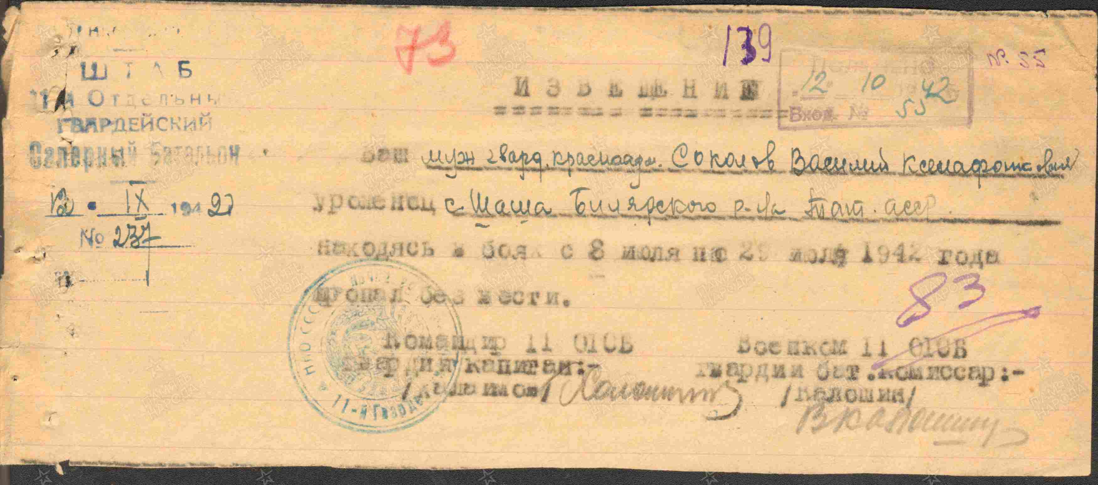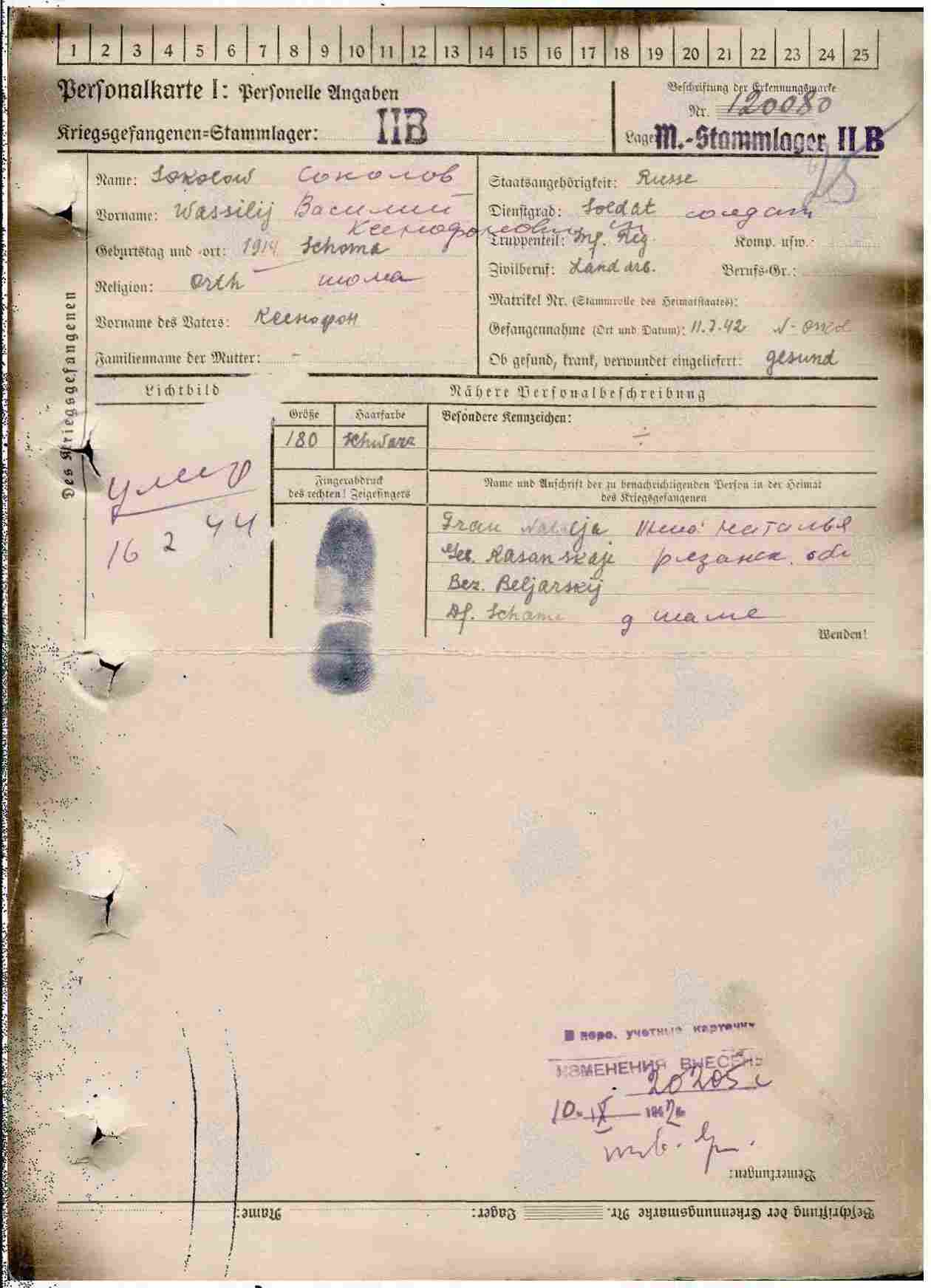 СОКОЛОВ Василий Ксенофонтович, 1914, с. Шама. Мобилизован 23 июня 1941 Билярским РВК. Красноармеец/ гв. красноармеец, сапёр 216 отд. СапБ/ 11 гв. отд. СапБ, 136 СД/ 15 гв. СД 9 А/ 18 А Южного фронта, 28 А Юго-Западного фронта. Учтён пропавшим без вести в июльских боях 1942 в Курской обл. Попал в плен 11 июля 1942 у г. Новый Оскол, Курская (Белгородская) обл. Содержался в лагере в/ пленных II B, Хаммерштайн (г. Чарне, Члухувски повят), Польша. Умер 16 фев. 1944.