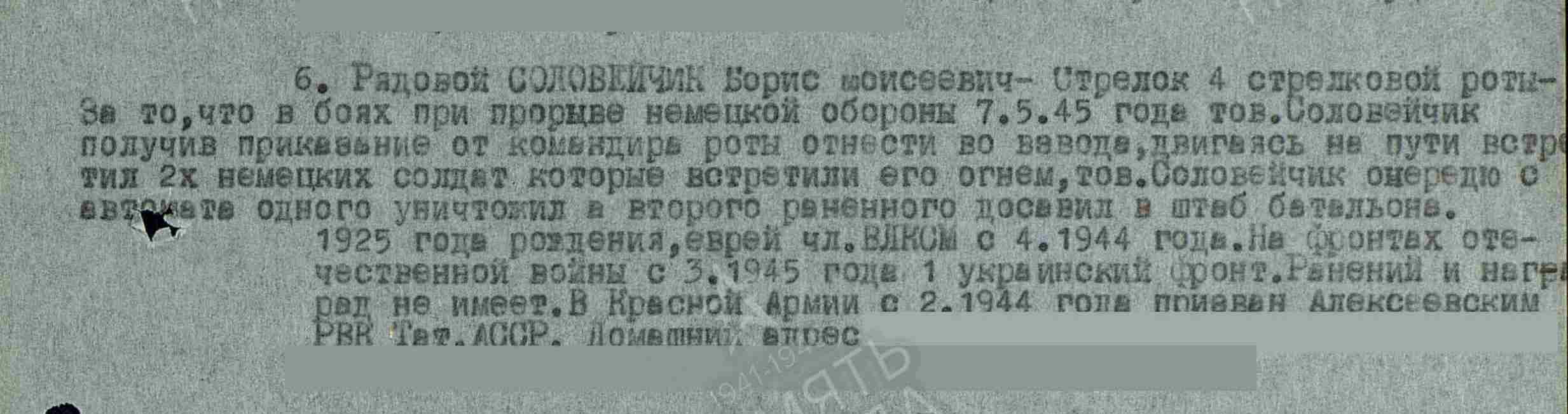 СОЛОВЕЙЧИК Борис Моисеевич, 1925, г. Вильнюс, Литва. С 1941 – в эвакуации. Мобилизован Алексеевским РВК 10 дек. 1943. Член ВЛКСМ. Красноармеец, 75 СП 31 СД 52 А 1 УкрФ (на фронте с марта 1945). Награждён медалью «За отвагу», орденом Отечественной войны 2 ст. (1985).