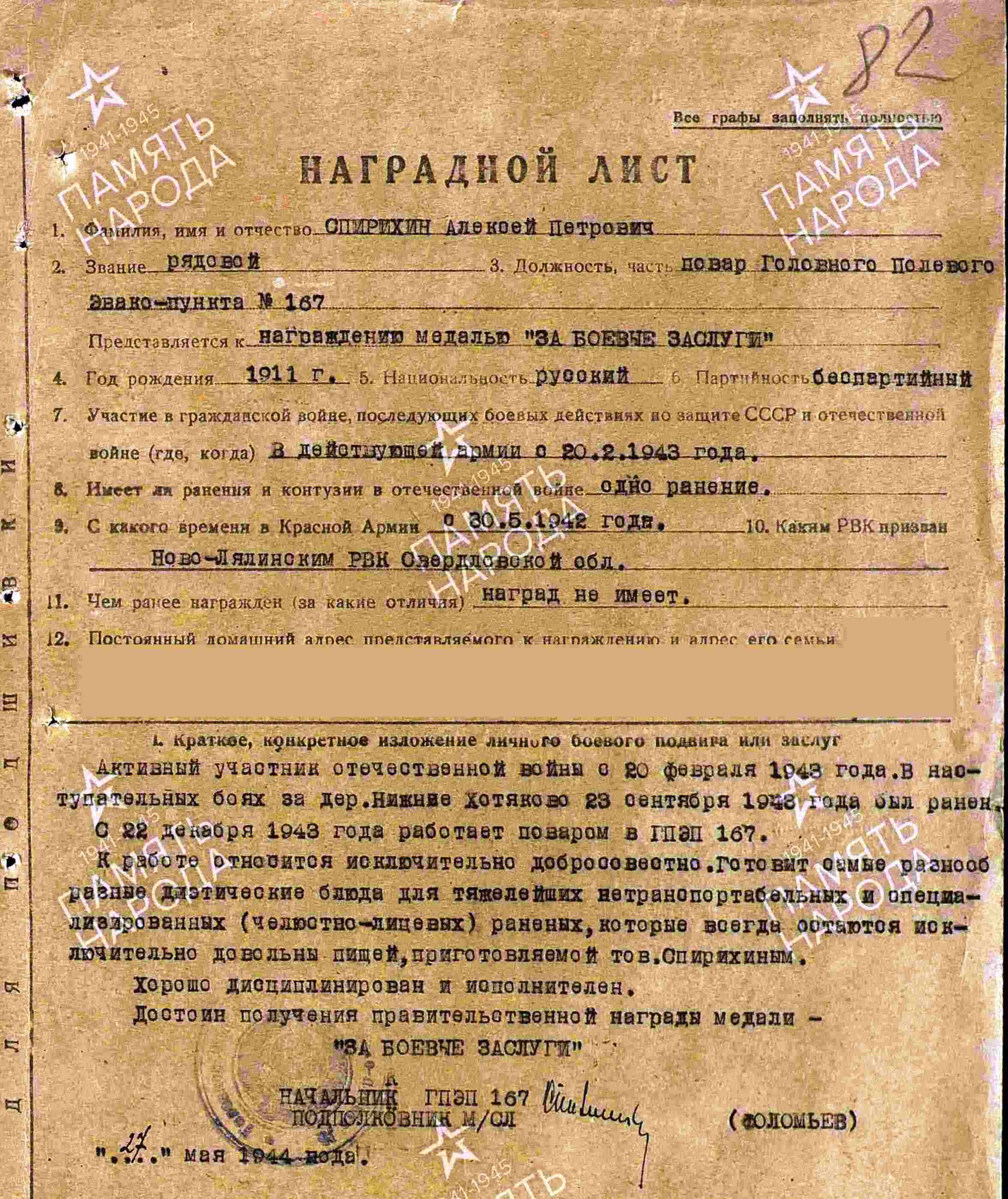 СПИРИХИН Алексей Петрович, 1911, с. Алексеевское. В 1931 семья раскулачена и выслана на Северный Урал. Мобилизован 30 мая 1942 Новолялинским РВК Свердловской обл. Красноармеец, стрелок. В боях с 20 фев. 1943. Тяжело ранен 23 сент. 1943 в бою за д. Нижнее Хотяково, Демидовский р-н, Смоленская обл. С 22 дек. 1943 служил в Головном полевом эвако-пункте № 167 на должности повара. Участвовал в освобождении Калининской, Псковской обл., Белоруссии, Прибалтики. Награждён медалью «За боевые заслуги». Скончался в 1977.