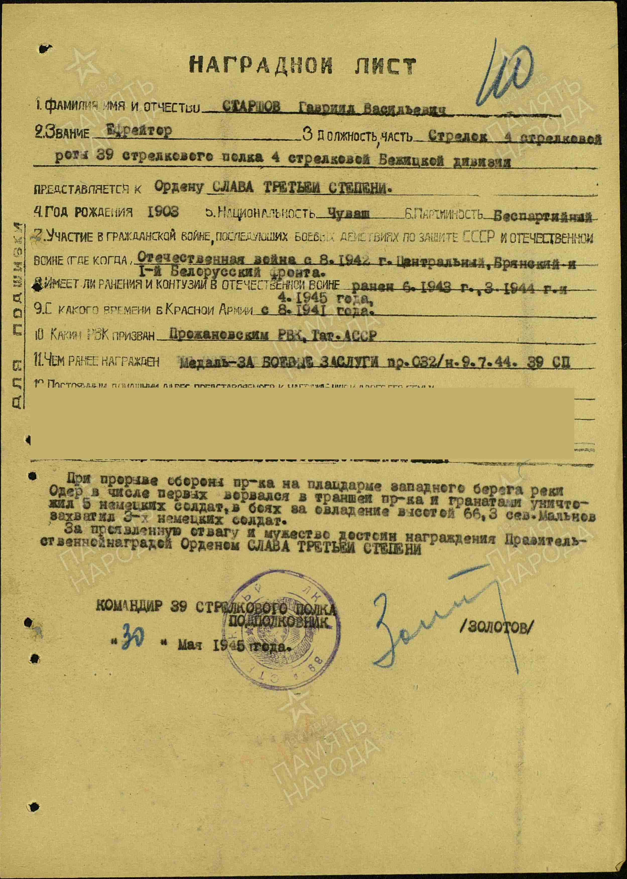 Награды: Орден Славы III степени Пр 58/н от31.05.1945г.