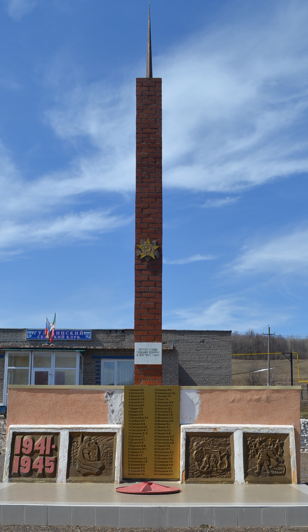 Стела находится на возвышенности, на которой прикреплен орден и табличка со славами "Вечная слава павшим воинам в 1941 - 1945 годах" наверху установлен пик. Основание 2 мемориальной стены с обеих сторон стелы вставки с барельефами изображающими сцены из военных сражений, таблички с высеченными фамилиями павших. Впереди звезда (огонь подключается только 9 мая). Имеются зеленые насаждения. Расположена на территории сельского клуба. Материал - железо - бетон. Построен на средства НГДУ "Заинск нефть" Датировка объекта 1996 год. Высота стелы 8,5 м., пик 1,5 м3, высота мемор. доски 3 м., ширина 8 м.
