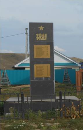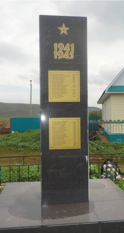 Датировка объекта 2011 год. Трехгранная стела из черного мрамора, наверху изображена пятиконечная звезда, цифры 1941 - 1945 - золотого цвета. Закреплены 6 табличек золотого цвета с выгравированными именами воинов - земляков, погибших в ВОВ. Огорожено металлическим заборчиком, имеются зеленые насаждения. Расположен на середине села. Высота 4 м.