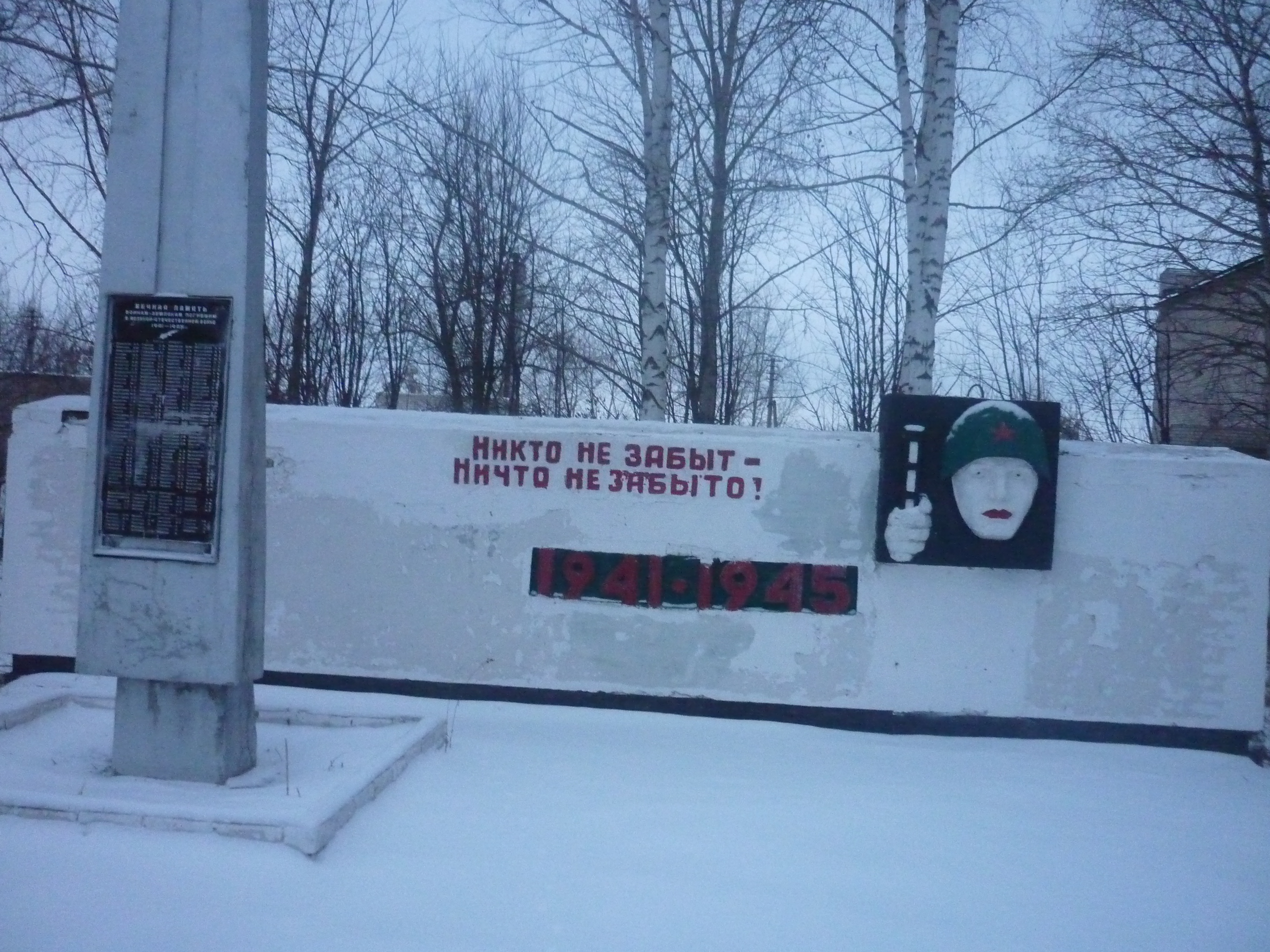 Стела сложена из кирпича , побелен. Размер:8х1,8 Имеется надпись "Никто не забыт, ничто не забыто". 1941-1945", изображение головы солдата. Имеется список участников.