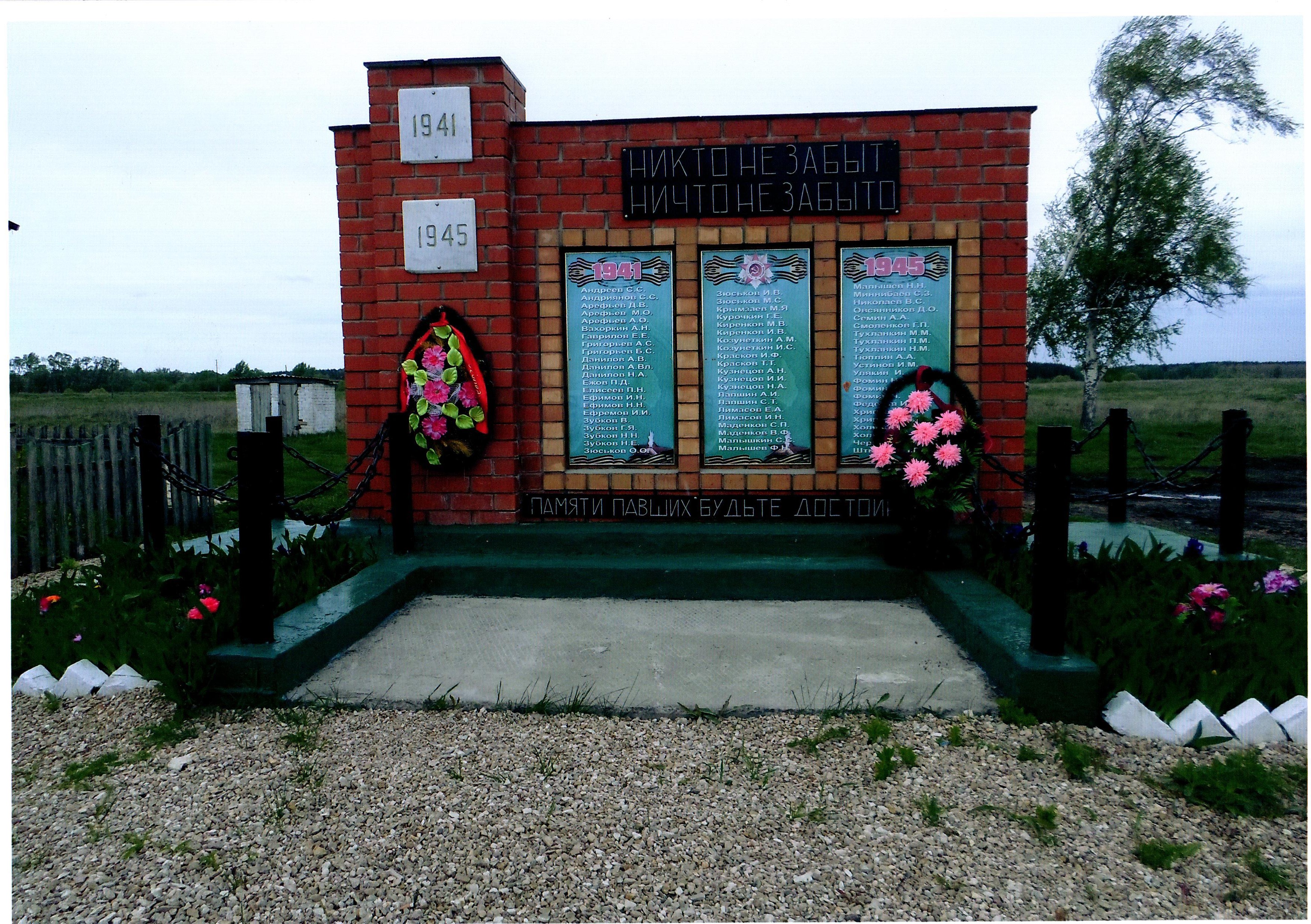 Длина 430см, ширина 50см,, высота 216 см. Сложен из красного кирпича, на старый фундамент, наверху имеется надпись "Никто не забыт, ничто не забыто". По центру имеется 3 плиты-таблички с именами участников Вов. Снизу надпись "Памяти павших будьте достойны". Села огорожена цепью.