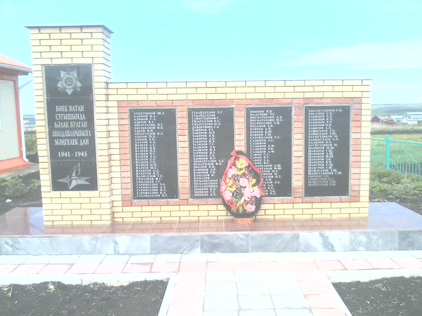 В 2014г. вместо старого памятника построили стелу из красного кирпича, и кирпича цвета "слоновая кость" Плиты из черного мрамора, ширина стены(основание)-5,4м, обделан по бокам мрамором, верх черным мрамором. На основании стоит стена из кирпичной кладки (4,5х1,7). На стене мраморные плитыравзмером (1,2х0,6) -4 шт. мраморной гравировкой ФИО погибших Вов. На основании еще стоит постамент размером 2,5х0,9. На постаменте черная мраморная плитаразмером 1,6х0,6. На верхней части плиты изображение ордена Отечественной войны, на нижней части изображение красной звезды, а посредине надпись "Бөек Ватан сугышында һәлак булган авылдашларыбызга мәңгелек дан 1941-1945". Перед стены обделан брусчаткой, шириной 0,6м, К стене ведет дороңка из брусчатки длина 7 м., ширина 1,5м.
