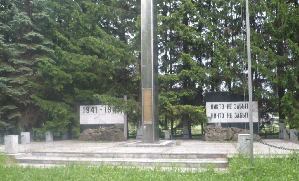 КРАТКОЕ ОПИСАНИЕ: Объект состоит из трех частей: стела 1х1х6м, облицована листами из нержавеющей стали; две гранитные плиты 2,5х4м с фамильным списком погибших в ВОВ.