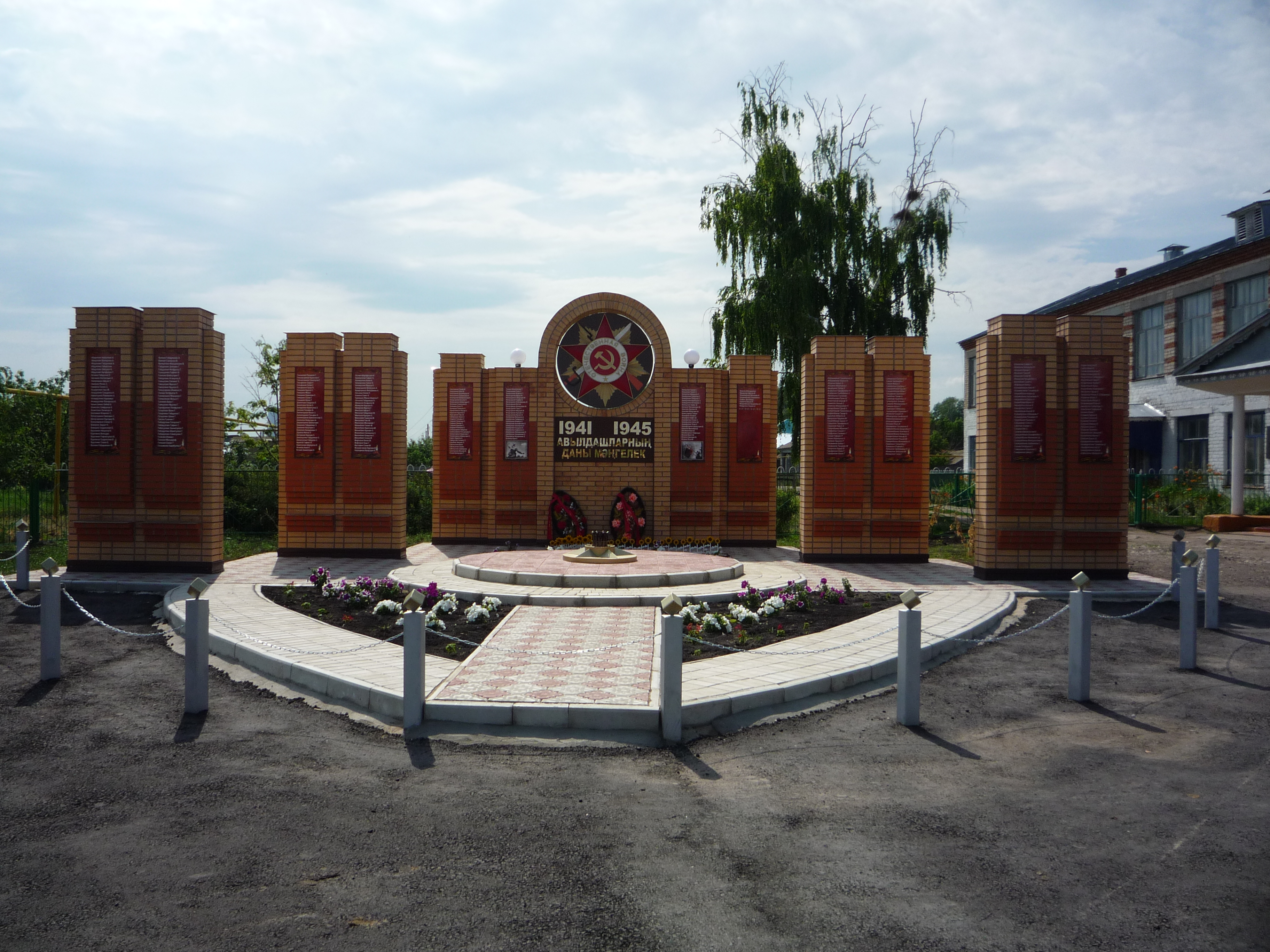 Стена из облицовоного красного и желтого кирпича. Высота 2,80, ширина 50см. 4 колонны(1,8, 1 колонна (5,10). По центру наверху стены - орден Отечественной войны из железа, d ордена 1,30. а с тыловой - мемориальные доски с именами погибших односельчан. В центре имеется вечный огонь. На входе- декоротивные столбы(ограждение) 12 шт, высотой 1м.