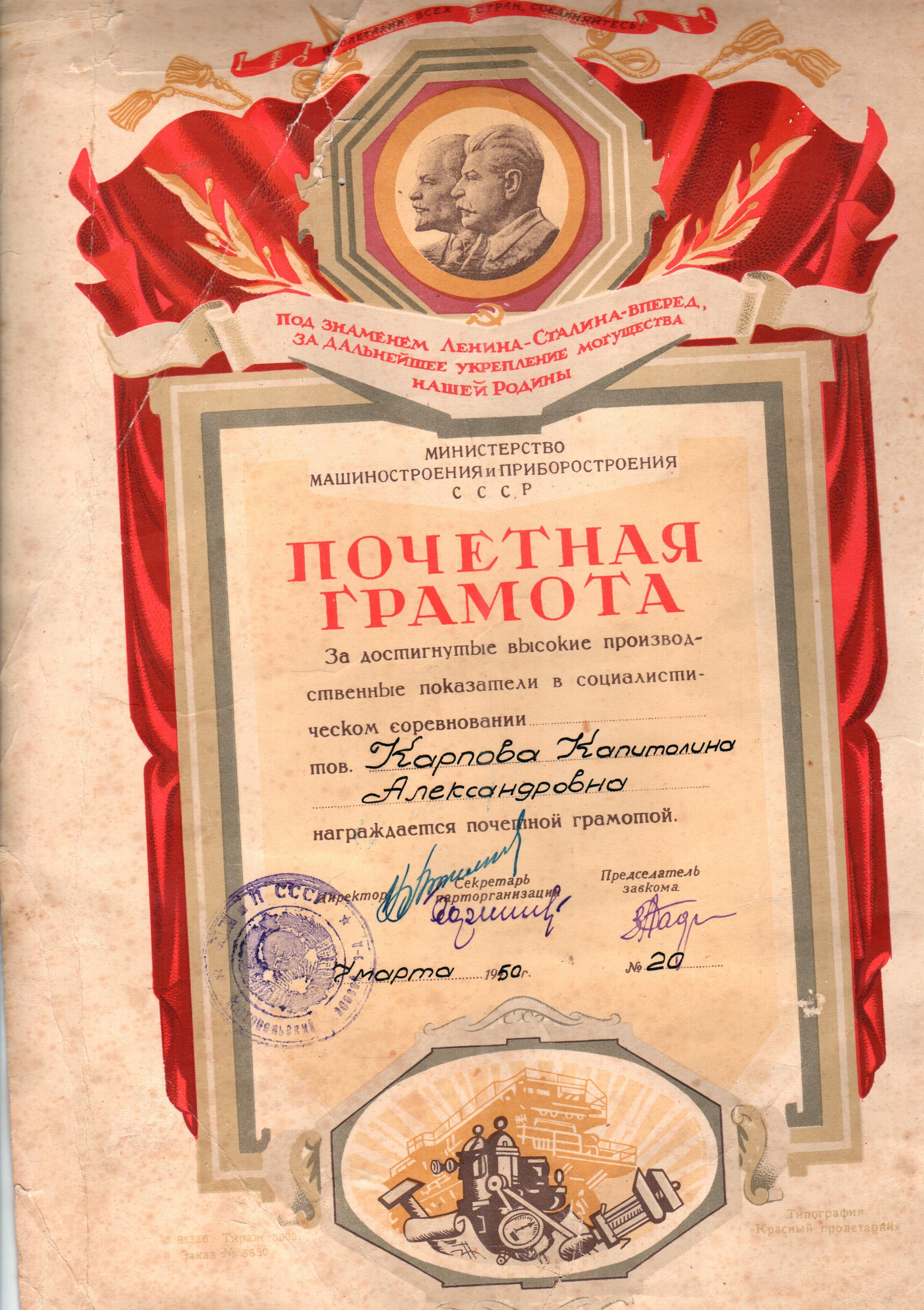 Капочка – так называли нашу героиню в детстве, и Капитолиной – в юности, которая совпала с нелегкими военными годами. Ее трудовая деятельность началась в 1942 году сразу после школьной скамьи. Работала на втором государственном часовом заводе народного комиссариата минометного вооружения, в мастерской по изготовлению часовых механизмов для мин. Годы были тяжелые, а воспоминания остались светлые. Просматривая фотографии тех лет, с теплотой вспоминает она своих коллег, среди которых было немало эвакуированных. Трудились не покладая рук, стараясь выполнить и даже перевыполнить норму – это было стратегической необходимостью. Передохнуть удавалось лишь, когда в мастерской выключался свет (тогда были перебои с электричеством). Как ни странно, но в минуты небольших передышек в мастерской звучал баян, принесенный кем-то из эвакуированных рабочих. Молодые заливистые голоса девчонок, работниц цеха, бойко выдавали под его аккомпанемент популярные куплеты, высмеивающие врага и прославляющие нашу Армию. Наш ветеран помнит каждое слово, каждую строчку из этих куплетов.