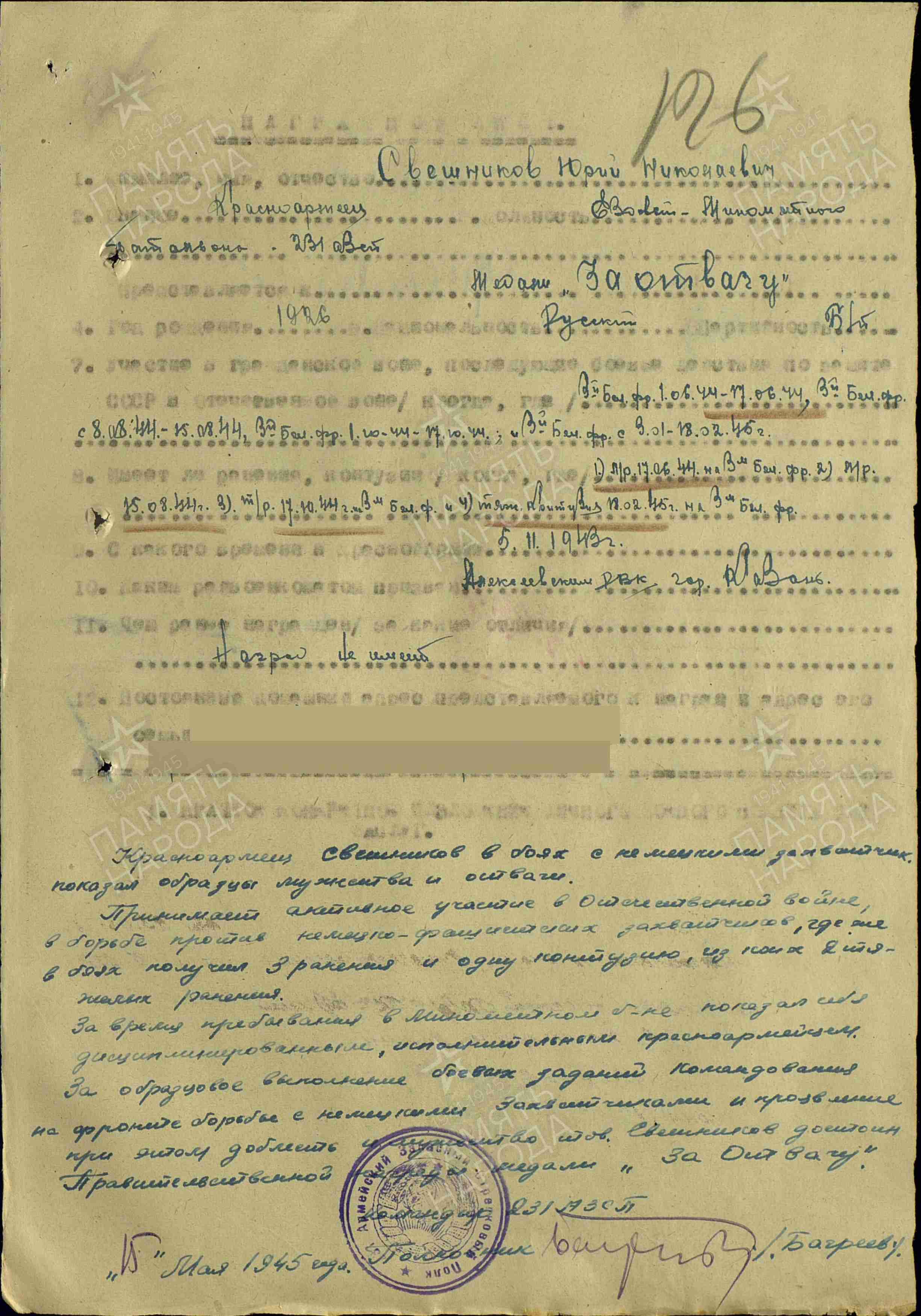 СВЕШНИКОВ Юрий Николаевич, 1926, с. Алексеевское. Мобилизован 5 нояб. 1943. Член ВЛКСМ. В боях с 1 июня 1944. Гв. красноармеец, 61 гв. СП 19 гв. СД 39 А 3 Белорусского фронта. Перенёс два лёгких ранения (17 июня 1944, 15 авг. 1944), одно тяжёлое ранение (17 окт. 1944), тяжёлую контузию (18 фев. 1945). После излечения направлен ездовым миномётного батальона 231 армейского ЗСП 39 А. Награждён орденом Отечественной войны 2 ст. (1945).