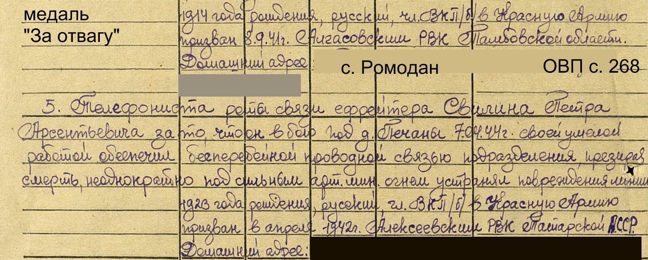 СВИЛИН Пётр Арсентьевич, 1923, д. Демидовка. Жил в с. Ромодан. Мобилизован Алексеевским РВК в 1942. Ефрейтор, телефонист роты связи 73 стр. полка 33 СД 1 УдА. Воевал на Калининском фронте. Участвовал в освобождении Прибалтики (2 Прибалт. фронт). В 1944 был ранен. Награждён медалью "За отвагу" в 1944, медалью "За победу над Германией", орденом Отечественной войны 2 ст. (1985). Работал в с. Ромодан столяром. Скончался в 1988.