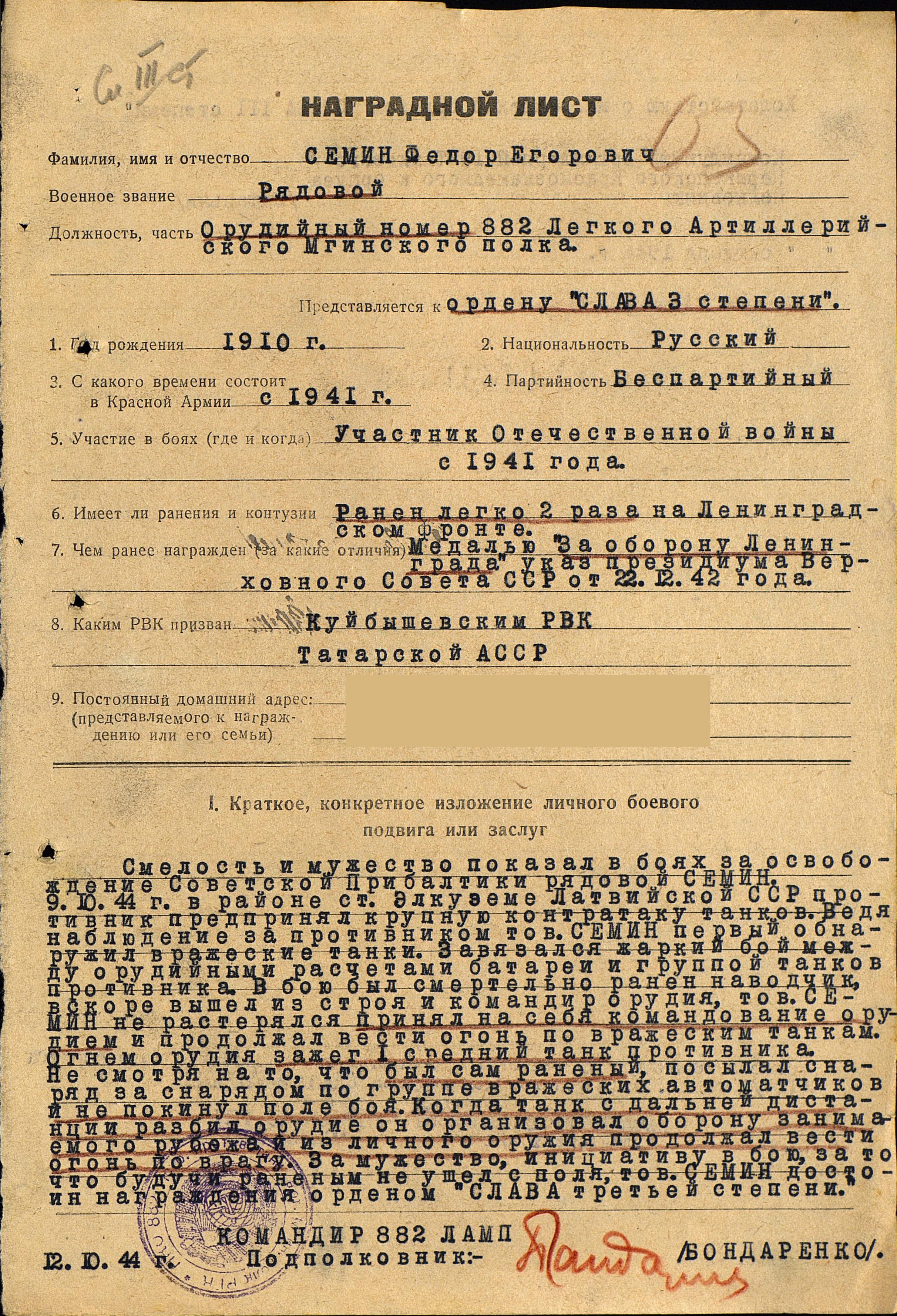 СЁМИН Фёдор Егорович, 1910, с. Базяково Спасского уезда Казанской губернии (позже Куйбышевский район ТатАССР, ныне Алексеевский район РТ). Мобилизован Куйбышевским РВК в 1941 г. Красноармеец (ефрейтор). Воевал на Ленинградском фронте, был дважды ранен. Награждён медалью "За оборону Ленинграда". Орудийный номер арт батареи 301 стр. полка 48 стр. дивизии и 882 легко-артиллерийского полка 19 Танкового корпуса 1 Прибалт. фронта. Участник освобождения Прибалтики. Отличился в бою 9 октября 1944 г. (в этом бою был ранен в третий раз): во время контратаки противника взял командование огнём орудия на себя, заменив смертельно раненого командира, сумел подбить 1 средний танк. После выхода орудия из строя организовал оборону занимаемого рубежа, несмотря на ранение не покинул поле боя. Награждён орденом Славы 3 ст., медалью "За победу над Германией". Демобилизован в 1945 г. После войны работал плотником. Скончался в 1978 г., похоронен в с. Базяково.