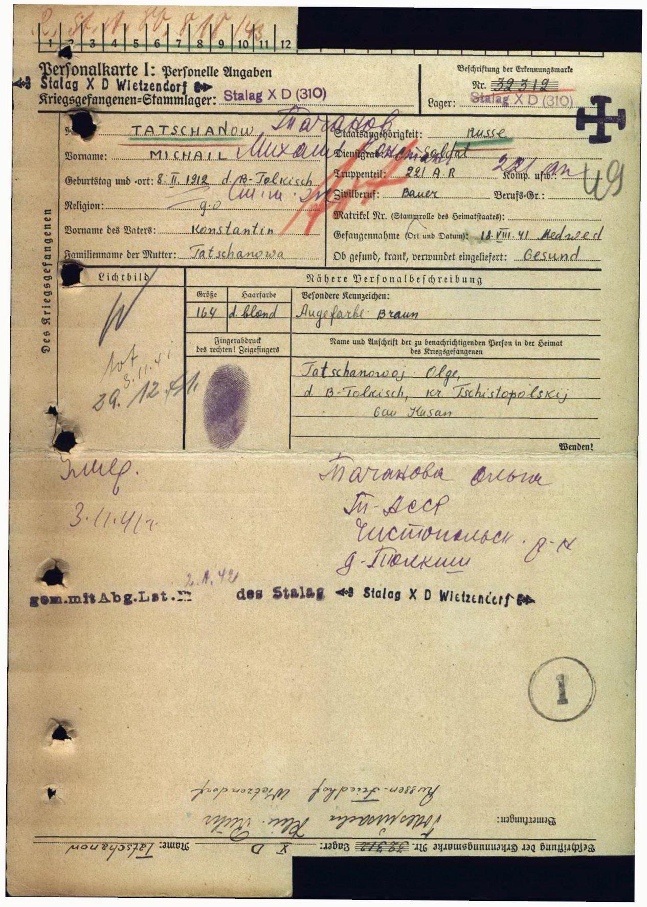 Родился 8 февраля 1912 г. в с. Большой Толкиш Чистопольского уезда Казанской губернии. Призван 23 июня 1941 г. Володарским РВК Ленинградской области. Последнее место службы: 70 сд. Пленен 18 августа 1941 г. под Медведями. Содержался в шталаге X D (310). Лагерный номер 32312. Красноармеец Тачанов Михаил Константинович погиб в плену 3 ноября 1941 года. Первичное место захоронения: Витцендорф.