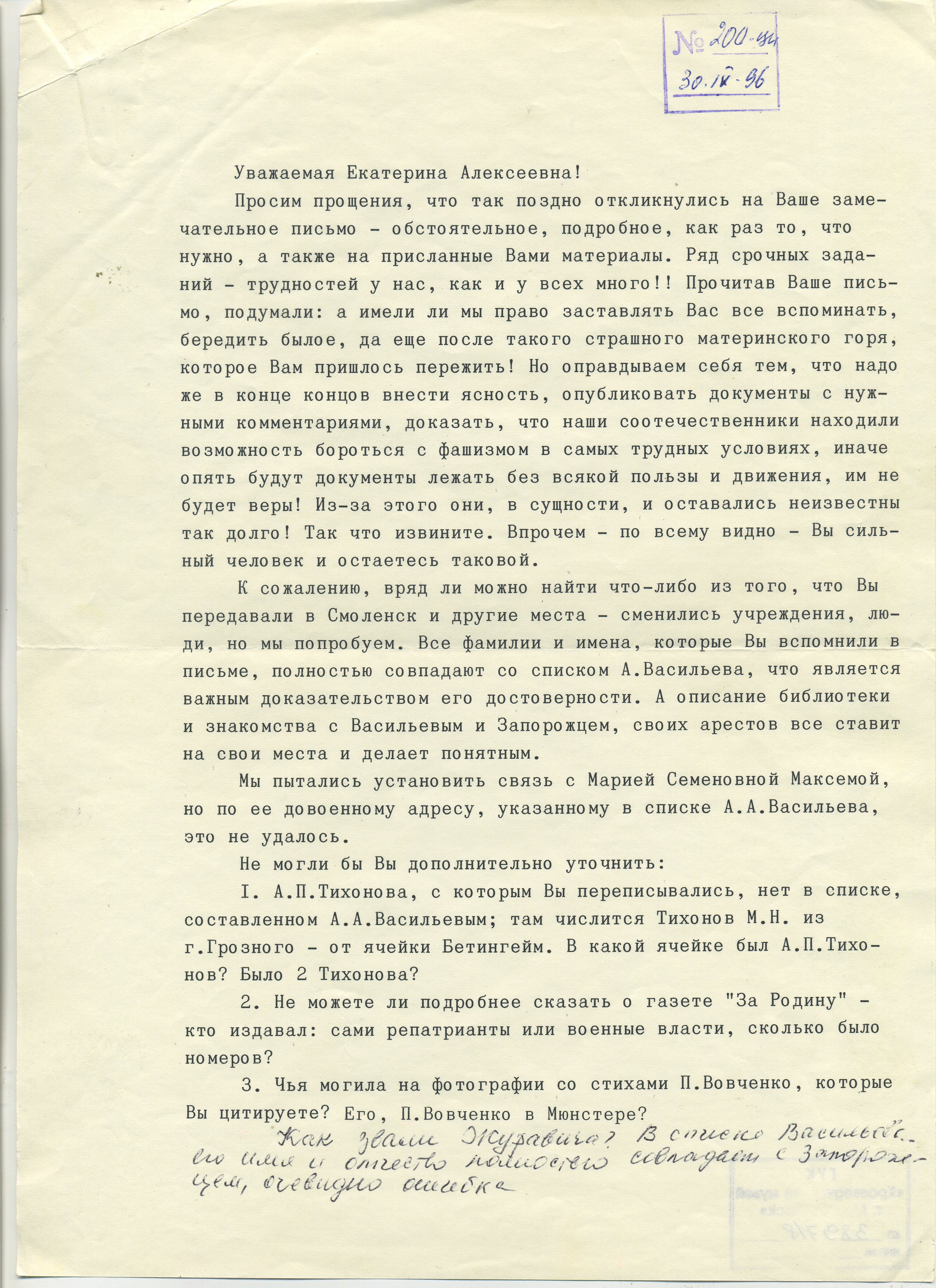 В журнале «Исторический архив» № 1 за 1997 год в статье «Советская молодежь в Германии» подробно рассказывается о деятельности Русской антифашистской организации, действовавшей в Штутгарте в годы войны. В ней приводятся воспоминания Екатерины Алексеевны, а ее фамилия названа в числе четверых членов основного ядра организации.