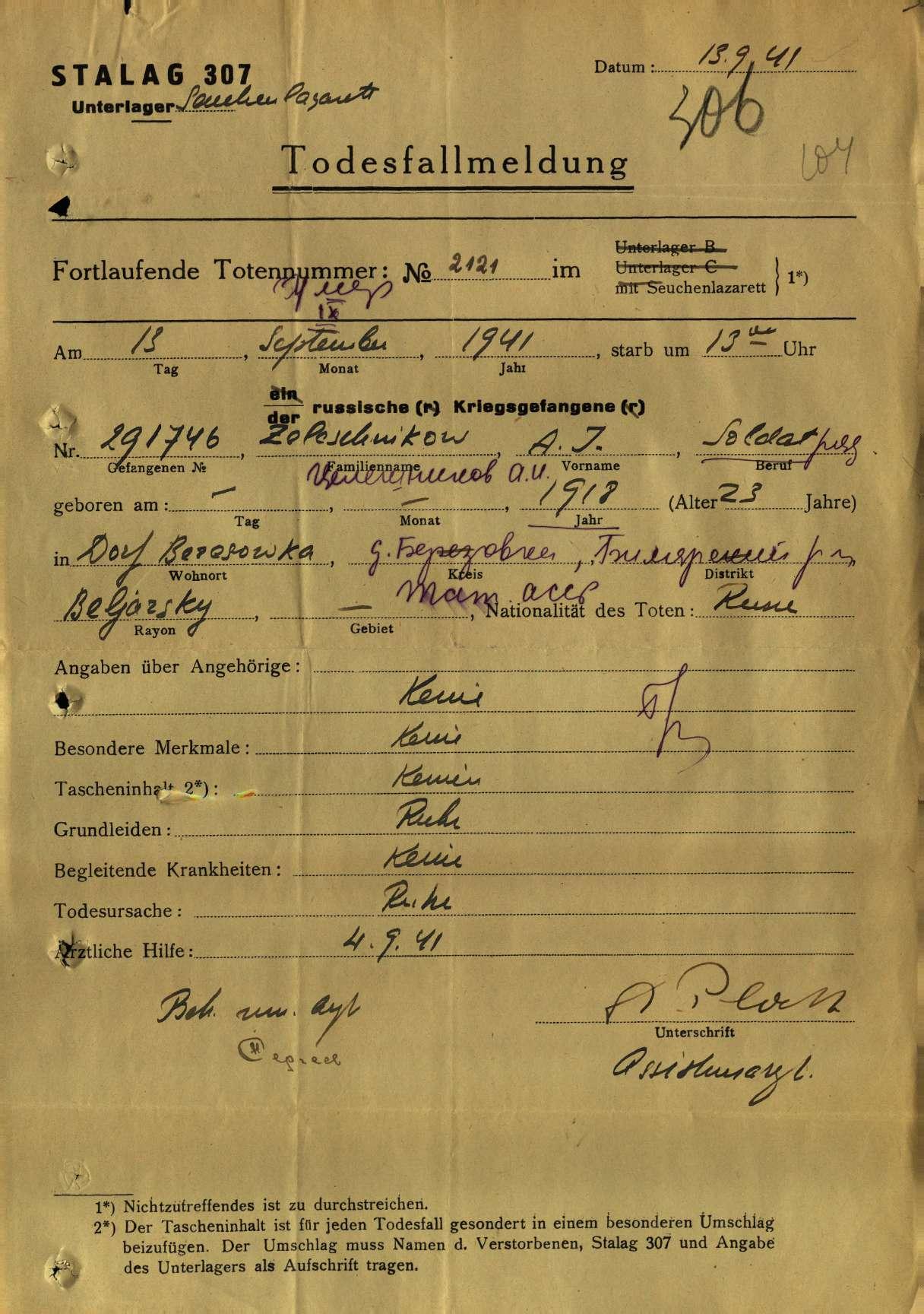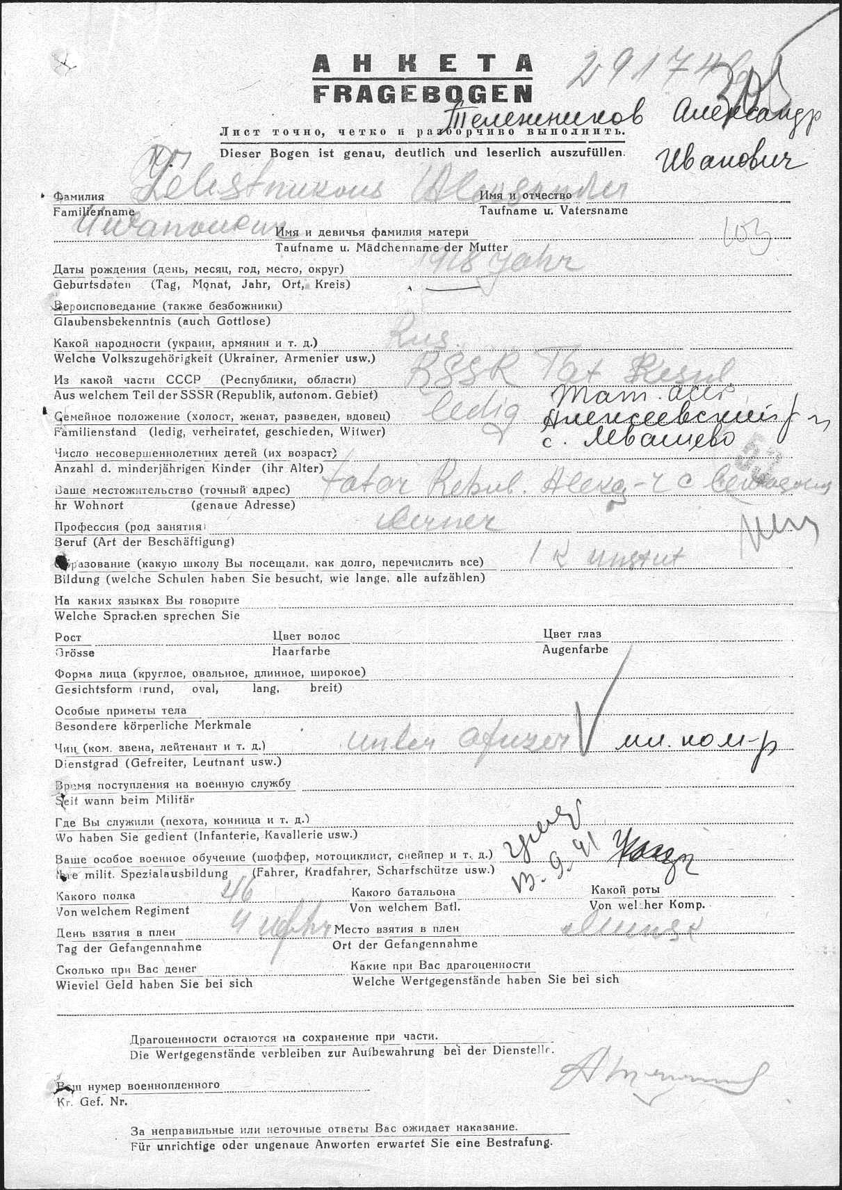 ТЕЛЕЖНИКОВ Александр Иванович (1918 г.р., с. Левашово). Родился в д. Берёзовка, Билярской волости. Работал в Левашевской школе учителем. Мобилизован Алексеевским РВК. Мл. командир (сержант) 46 инженерно-саперного полка. Попал в плен под Минском. Умер в лагере военнопленных № 307 13.09.1941, г. Демблин, Бяла-Подляска, Польша.