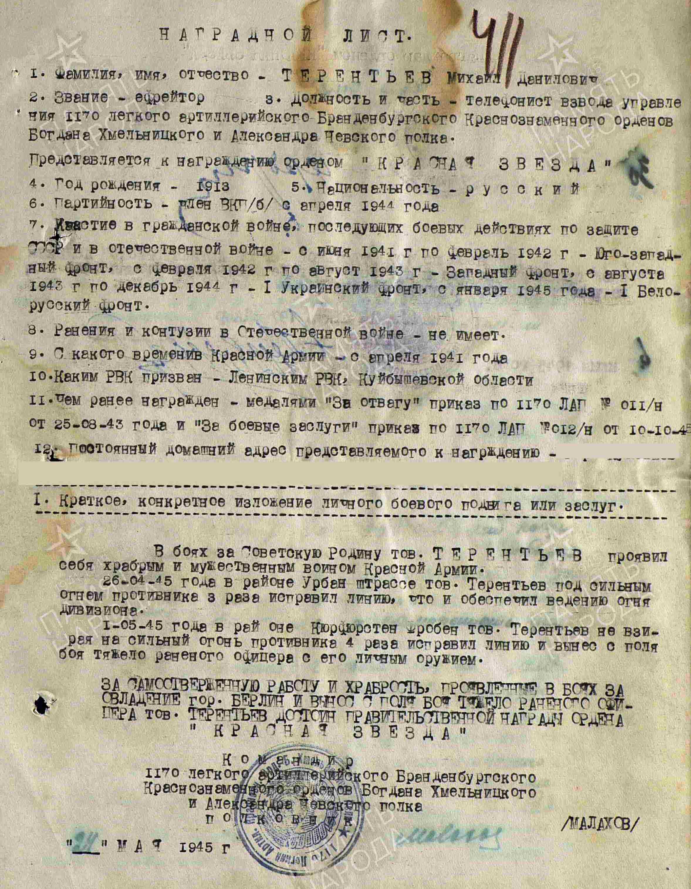 ТЕРЕНТЬЕВ Михаил Данилович, 1913, с. Большой Красный Яр. Призван по досрочной мобилизации в апр. 1941 Ленинским РВК г. Куйбышев. Воевал с лета 1941 на Юго-Западном, Западном, Брянском, 1 Украинском, 1 Белорусском фронте с составе 20 А/ 29 А/ 50 А/ 16 А/ 11 гв. А/ 1 гв. А/ 38 А/ 12 А/ 5 гв. А. Член ВКП(б) с 1944. Красноармеец/ ефрейтор, телефонист дивизиона 1170 ЛАП 15 ЛАБр 3 АД прорыва РГК/ 8 АК прорыва. Участник битвы на Курской дуге (северный фас, наступательный этап), освобождения Украины, Польши, штурма Берлина. Награждён медалями «За отвагу», «За боевые заслуги», «За взятие Берлина», орденом Красной Звезды.