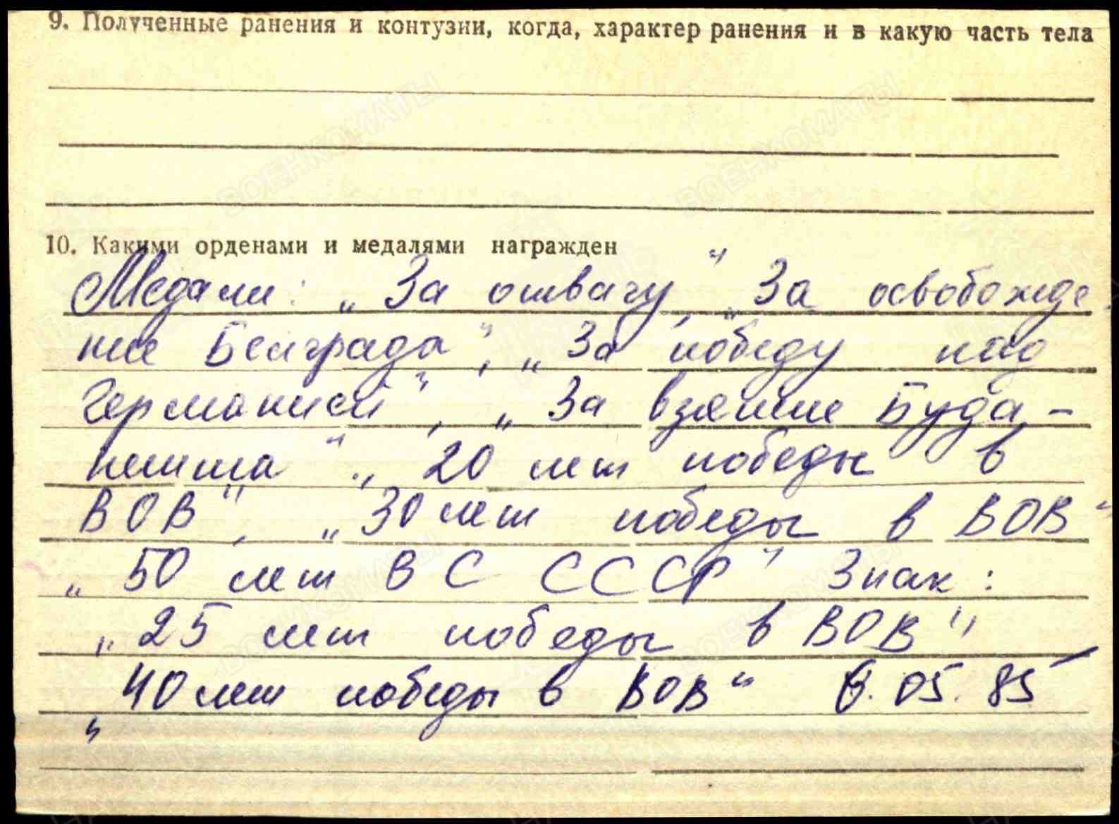 Награжден орденом Отечественной войны II степени, медалями «За отвагу», «За взятие Будапешта», «За освобождение Белграда», «За взятие Вены», «За победу над Германией в Великой Отечественной войне 1941-1945 гг.», юбилейными.