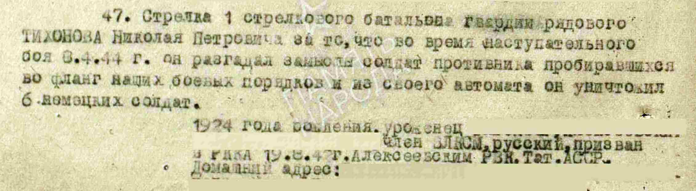 ТИХОНОВ Николай Петрович, 1924, с. Балахчино. До призыва в армию работал в к-зе «Красная горка». Мобилизован Алексеевским РВК 18/20 авг. 1942. Член ВЛКСМ. Воевал на Воронежском, Западном, 2 Прибалтийском фронте в составе 3 гв. А/ 21 А/ 10 гв. А. Гв. красноармеец, стрелок 4 гв. МСБр 2 гв. ТК. Ранен в 1943. Проходил лечение в ППГ/ГЛР 471, Смоленская обл. В 1944 – гв. сержант, 98 гв. СП 30 гв. СД. Награждён медалью «За отвагу». Умер от ран 31 июля 1944 в ХППГ 130 (сквозное пулевое ранение пояснично-крестцовой обл. с повреждением позвоночника, сепсис, гнойный цистит, пиелит), п. Бажаницы, Бежаницкий р-н, Псковская обл.