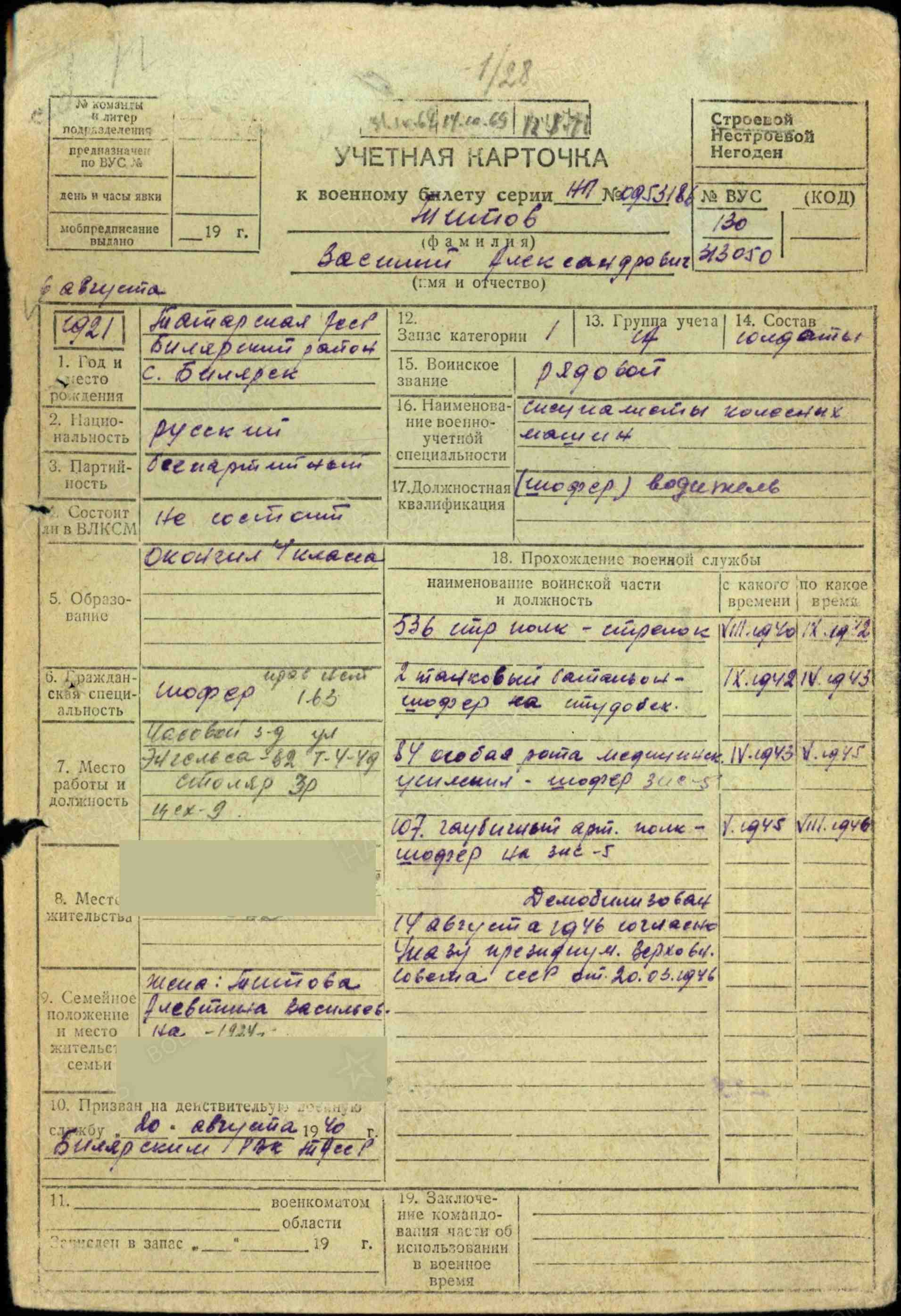 ТИТОВ Василий Александрович, 1921, с. Билярск. Призван в РККА 20 авг. 1940. Служил в Забайкалье, красноармеец, стрелок 536 СП 114 СД. С 1941 воевал на Северном и Карельском фронте в составе 7 А. Тяжело ранен в 1942 в ногу. С 1943 – шофёр а/м ЗиС-5 и «Студебеккер» в танковом подразделении и 84 отд. роты медицинского усиления. В 1945 участвовал в Советско-японской войне. После окончания боёв служил в гаубичной артиллерии. Демобилизован 14 авг. 1946. Жил в г. Чистополь, работал столяром цеха № 9 Чистопольского часового завода. Награждён медалью «За победу над Японией», орденом Отечественной войны 2 ст. (1985).