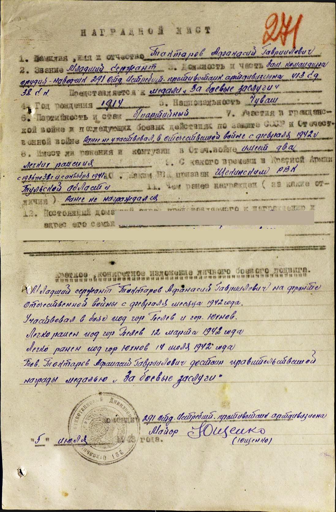 Награжден медалью «За боевые заслуги» (При №21 от 15.07.1943г.)