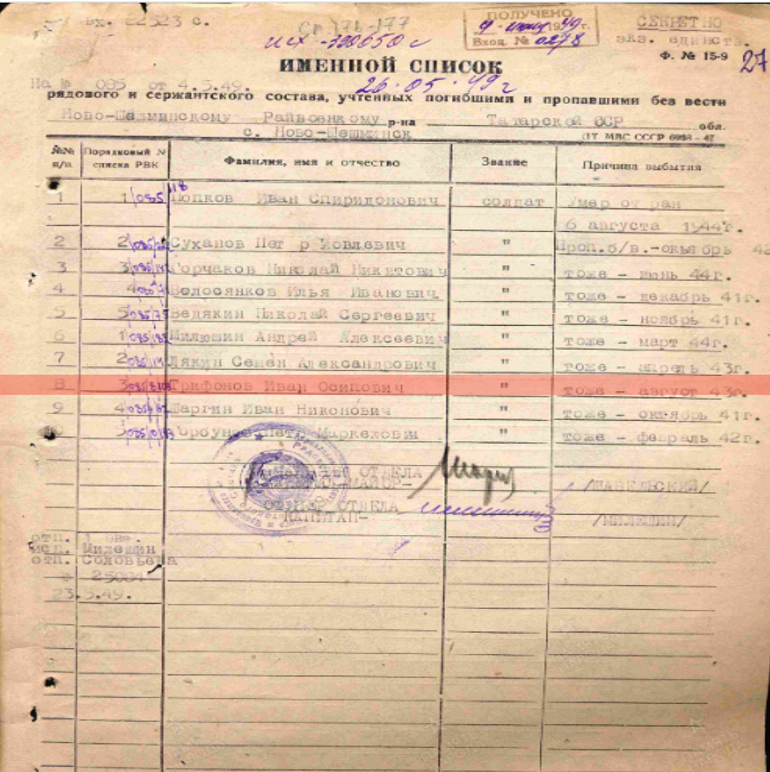 Трифонов Иван Осипович родился с. Ново-Шешминск, Ново-Шешминский р-н, Татарская АССР. Дата и место призыва: Ново-Шешминский РВК, Татарская АССР, Ново-Шешминский р-н. Воинское звание: рядовой. Причина выбытия: пропал без вести. Дата выбытия: __.08.1943 г.