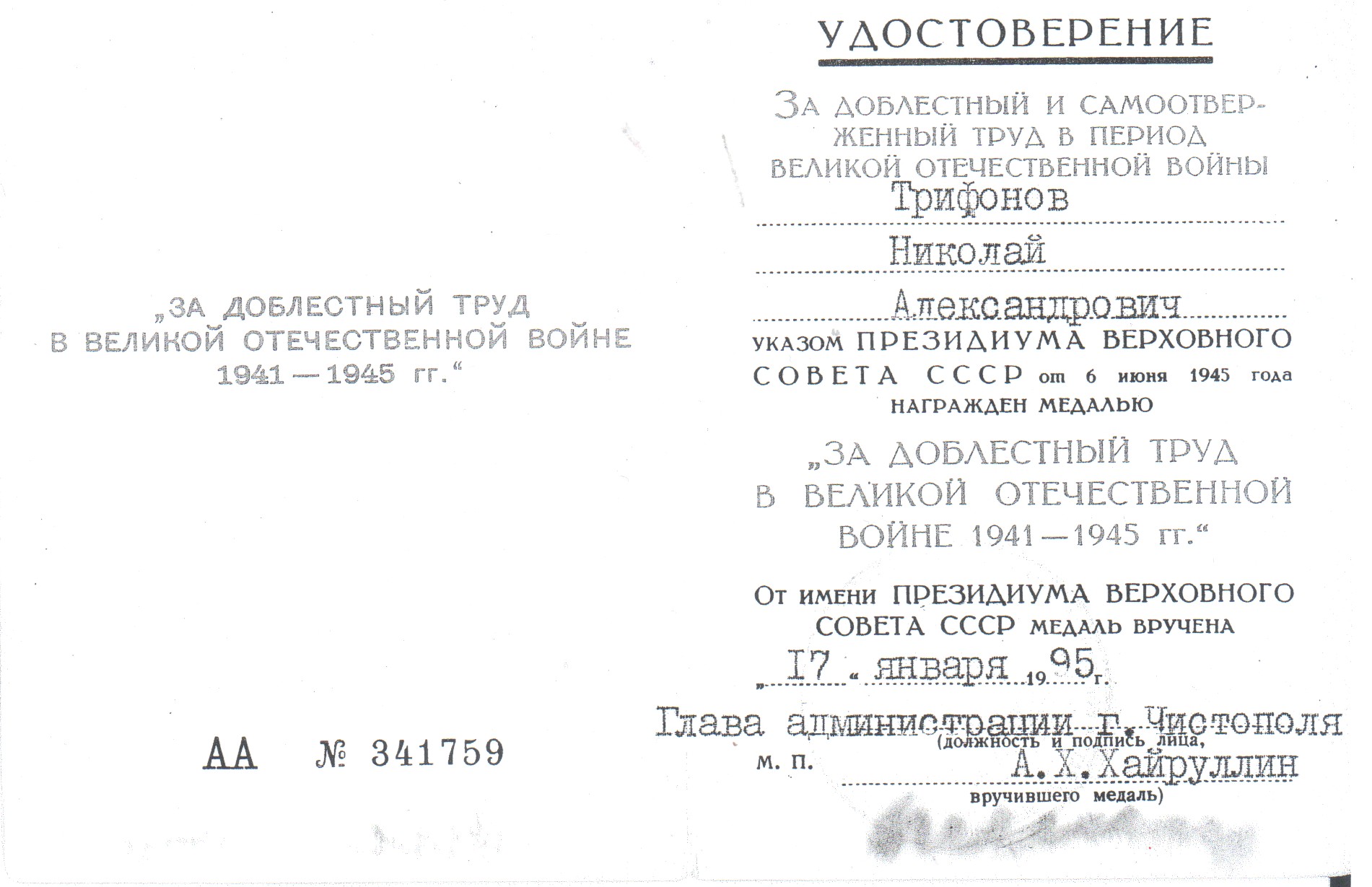 ТРИФОНОВ Николай Александрович родился в 1929 г. 18 мая в д. Бутлеровка Алексеевского района. В годы войны работал на Нижнекамском Техническом участке. В 1944 году переведен на должность помощника механика МЦ-1. Ветеран труда. Награжден медалью "За доблестный труд в Великой Отечественной войне 1941-1945гг." в 1995 г. После войны получил средне-техническое образование по специальности "Судомеханик". Работал в сфере речного транспорта и жил в г. Чистополь.