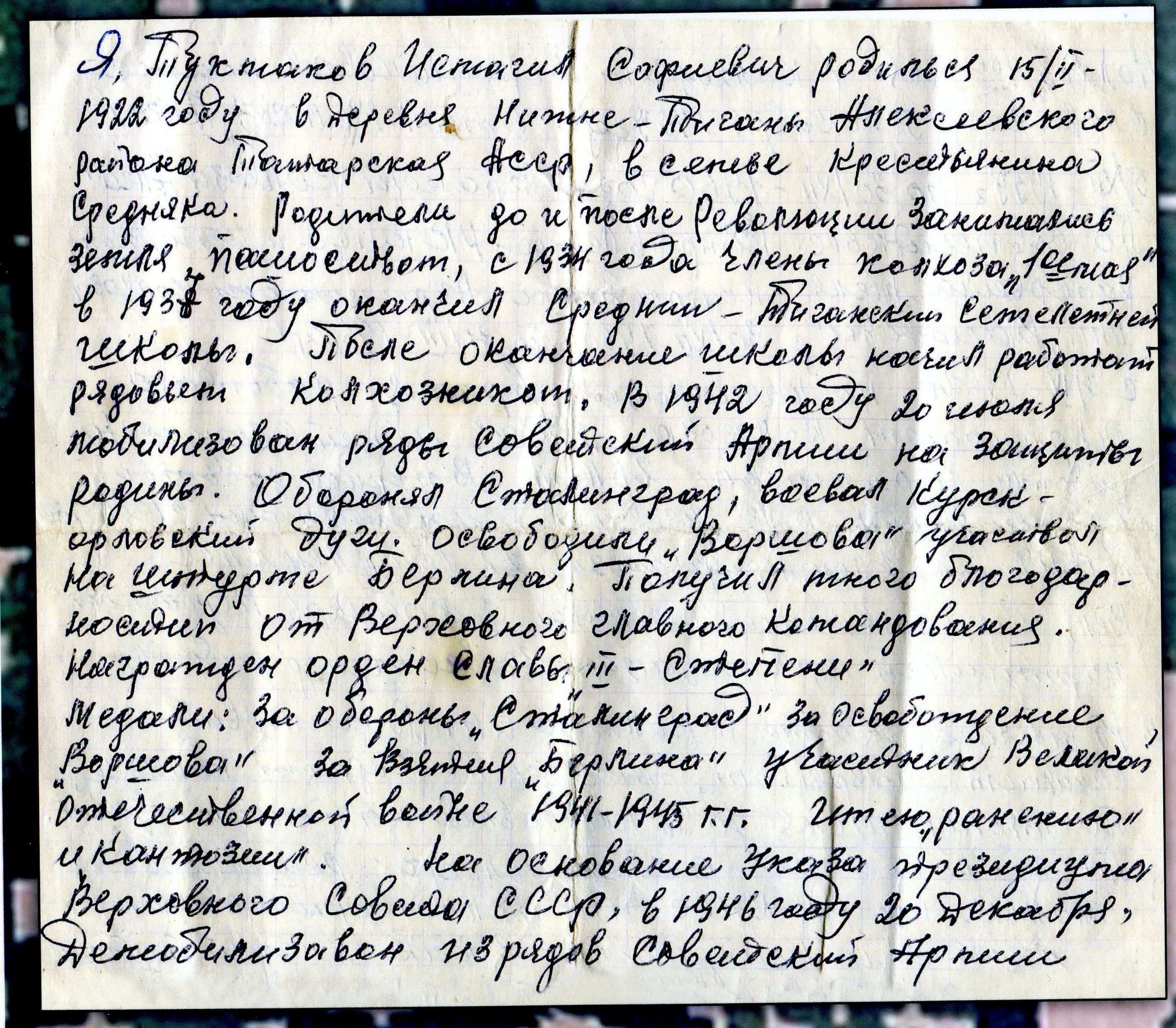 ТУКМАКОВ Исмагил Ахмедсафиевич, 1922, с. Нижние Тиганы. Перед войной и до июля 1942 работал рядовым колхозником в к-зе "1-е мая". Мобилизован Алексеевским РВК. Гв. красноармеец, минёр 7 гвард. моторизованного инженерного батальона. Воевал на Сталинградском, Донском, Центральном, 1 Белорус. фронтах. Был легко ранен в ноябре 1942 г. Участвовал в Сталинградской битве, Орловско-Курской битве, освобождении Белоруссии, Польши, штурме Берлина. Награждён орденами Славы 3 ст. (1944), Отечественной войны 2 ст. (1985), медалями "За оборону Сталинграда", "За победу над Германией", "За освобождение Варшавы", "За взятие Берлина". Демобилизован в 1946 г. Работал агрономом в колхозе "Алга". Скончался в 1988 г., похоронен в с. Нижние Тиганы.